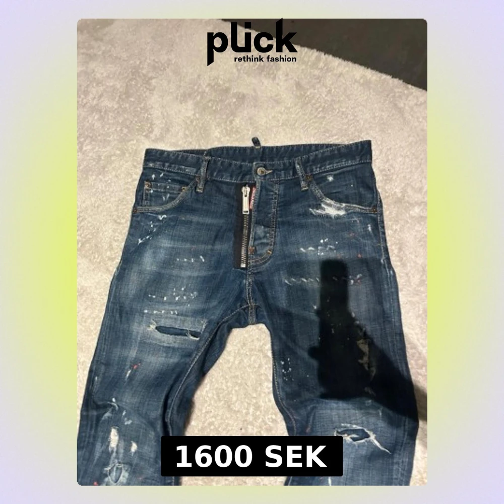 Säljer ett par äkta blå DSQUARED2 jeans i skinny fit med coola slitningar, färgstänk och en stor dragkedja framtill. Jeansen har klassisk femficksdesign och är gjorda i bomull. Perfekt för dig som gillar streetstyle och vill sticka ut.