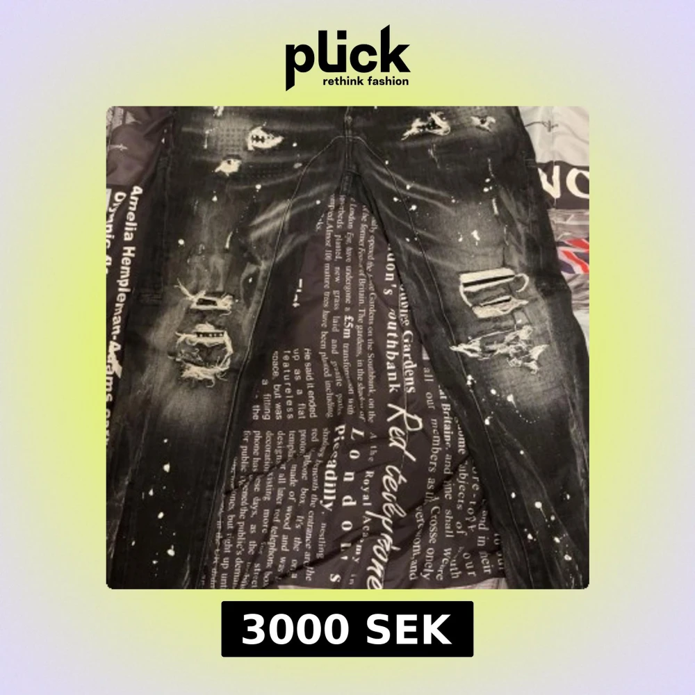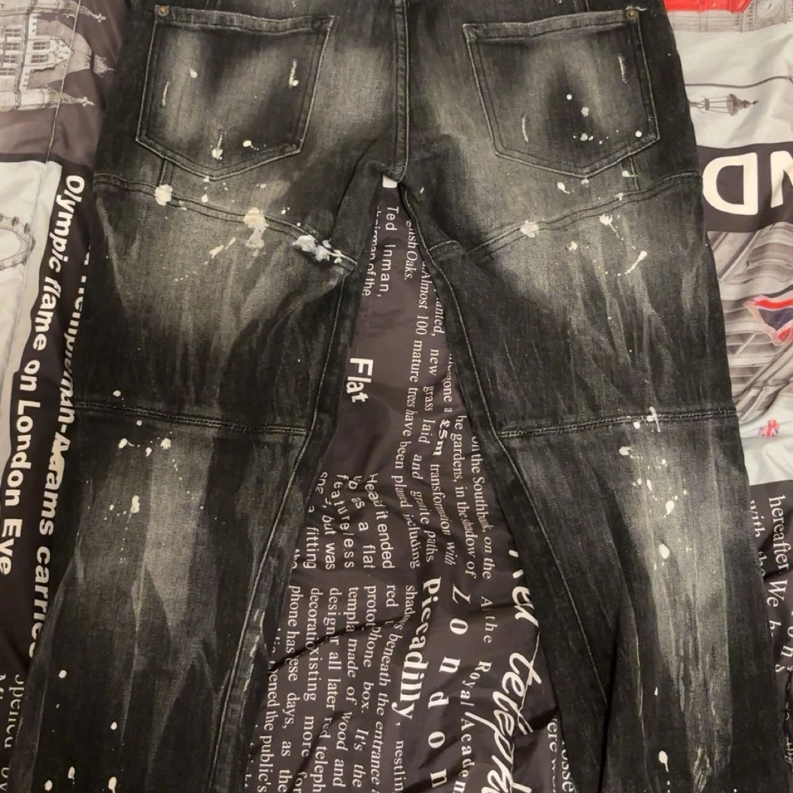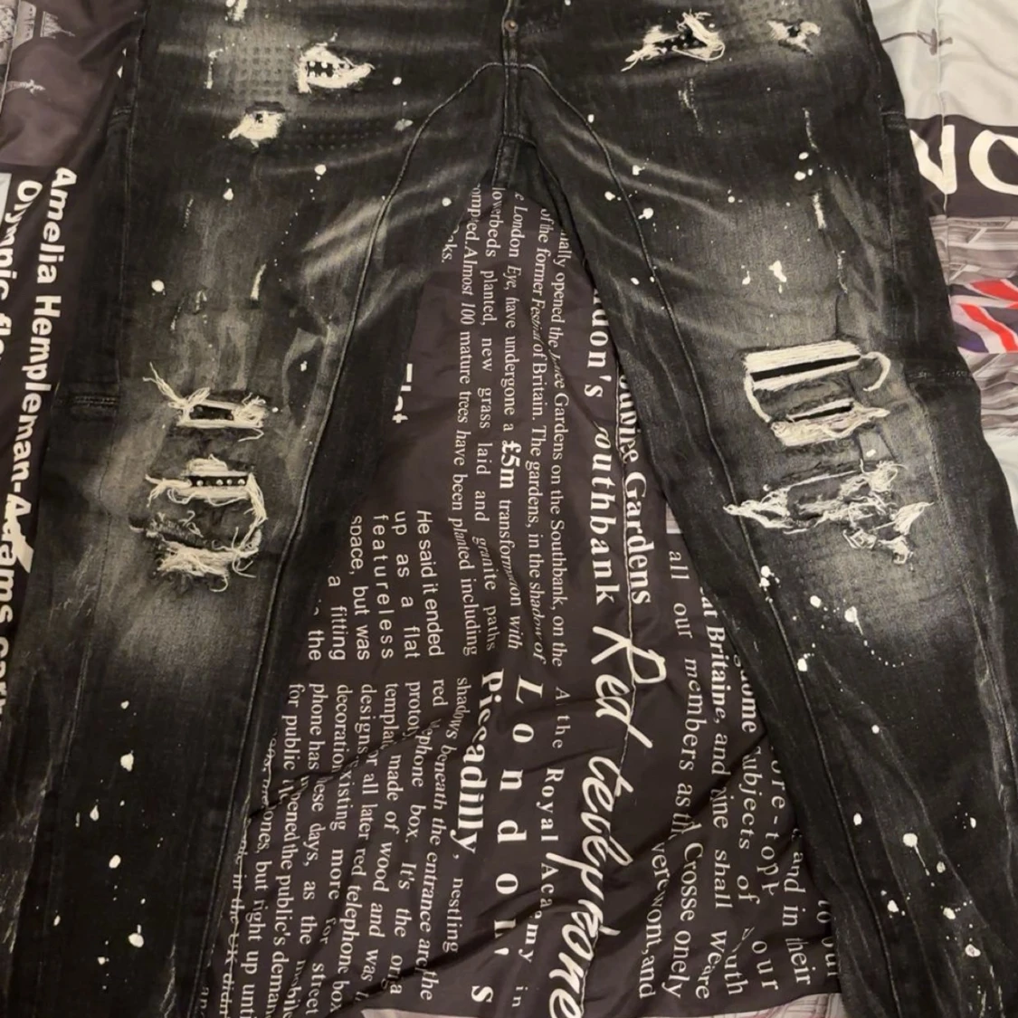 Riktigt snygga svarta jeans med slitningar, hål och coola färgstänk över hela byxorna. Jeansen har en lite tvättad look och flera trasiga detaljer på benen för en edgy streetstyle. Perfekta för dig som gillar en rå och trendig stil. Säljs ej längre och pris kan diskuteras