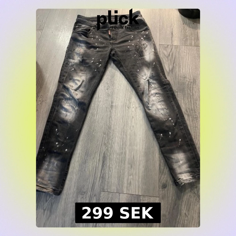 Säljer ett par svarta jeans från Dsquared2 i storlek 56. De har coolt splattermönster och slitna detaljer på benen, samt Dsquared2-logga på fickan och bak. Jeansen har en rak passform och är tillverkade i klassiskt denimtyg.