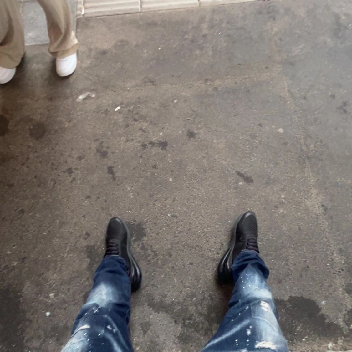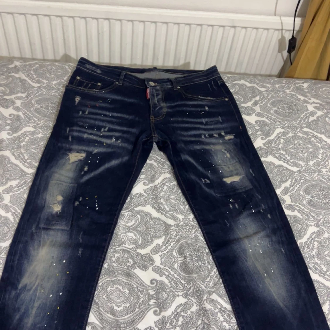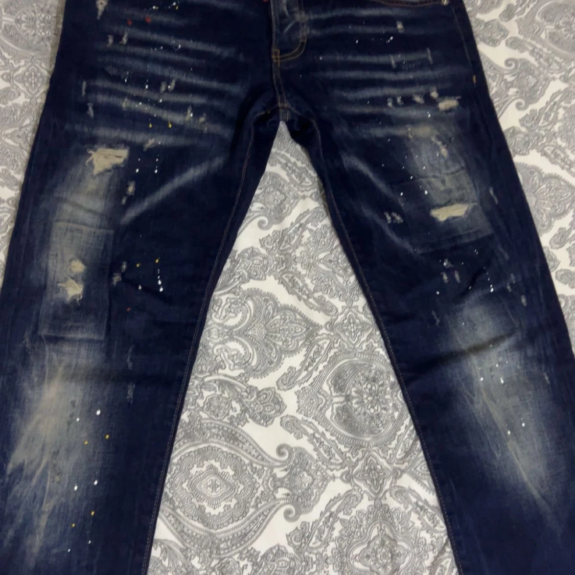 Säljer ett par mörkblå jeans med slitna detaljer och coola färgstänk. Jeansen har raka ben och klassisk femficksdesign. Perfekta för dig som gillar en streetig och avslappnad stil.