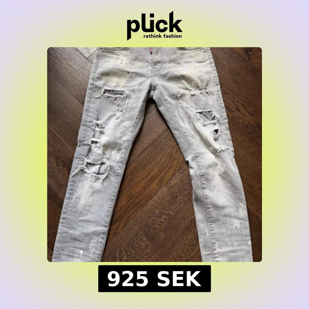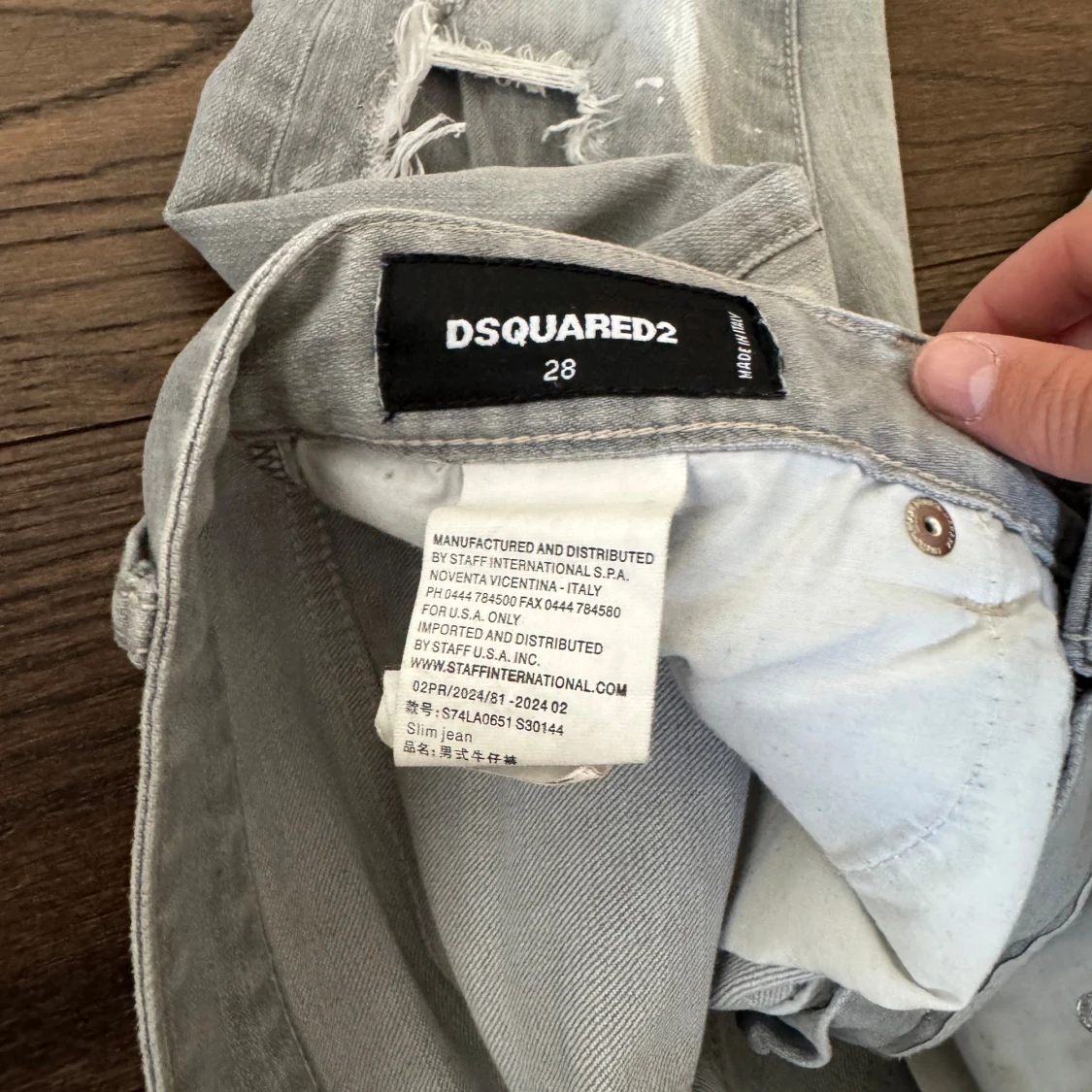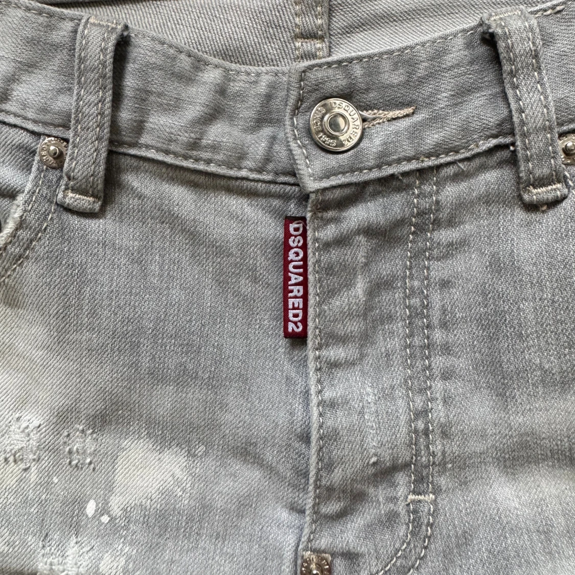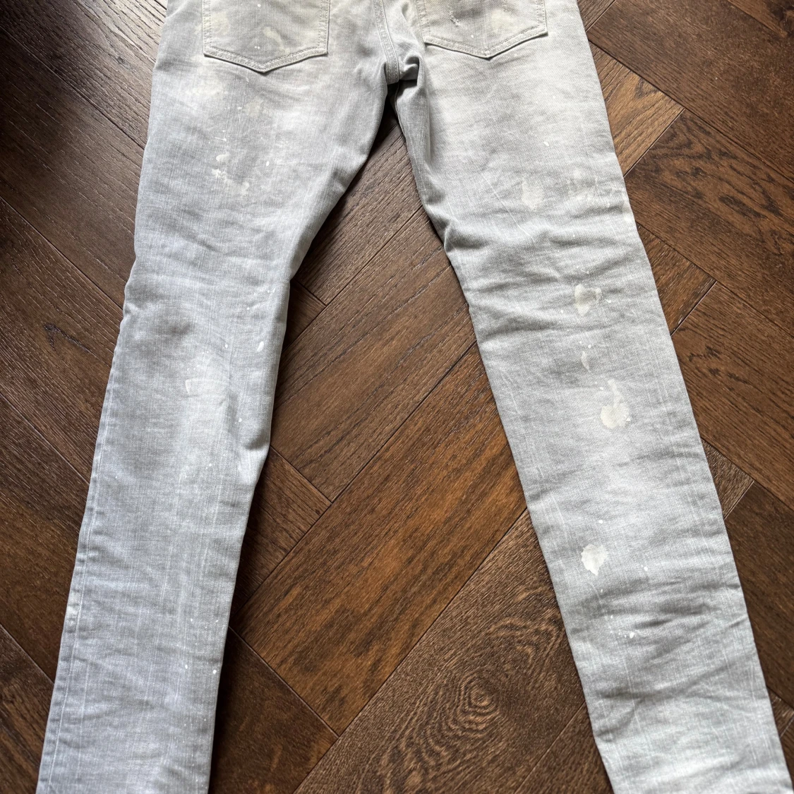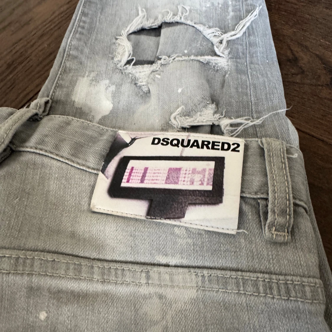 Snygga grå jeans från Dsquared2 med slitna och trasiga detaljer, färgstänk och coolt Dsquared2-märke bak. Modellen är slim och har klassisk femficksdesign. Skriv om du vill ha fler bilder och pris kan diskuteras.