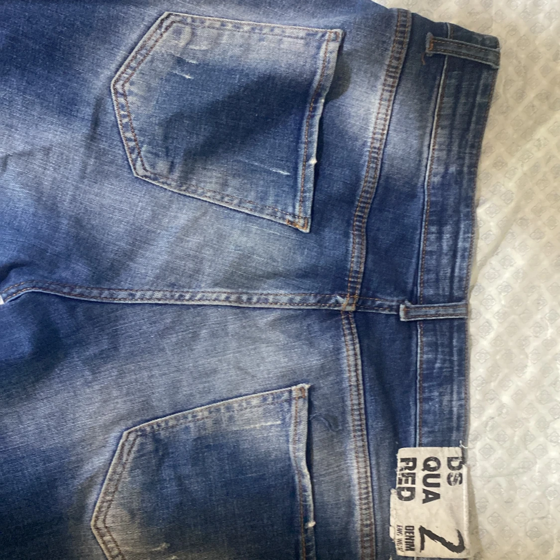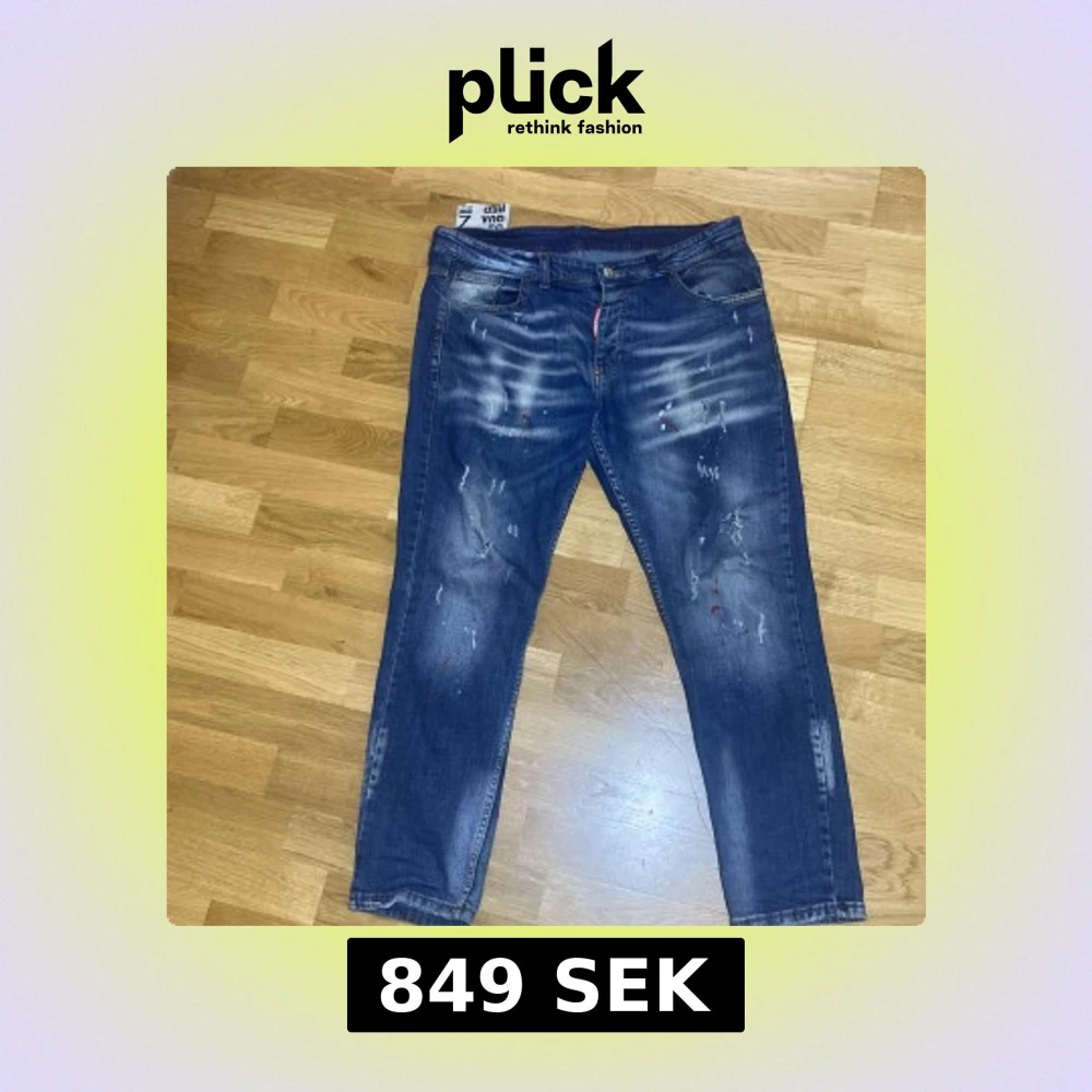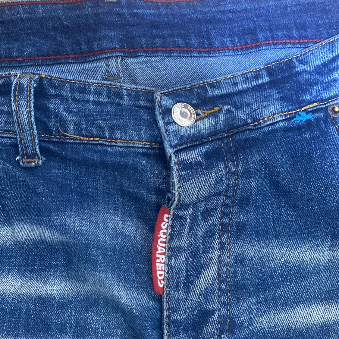 Snygga blå jeans från Dsquared2 med coola slitningar, färgstänk och en tvättad look. Klassisk femficksmodell med rakt snitt och röda detaljer vid gylfen. Jeansen har en modern vibe och passar perfekt till streetwear-stilen.