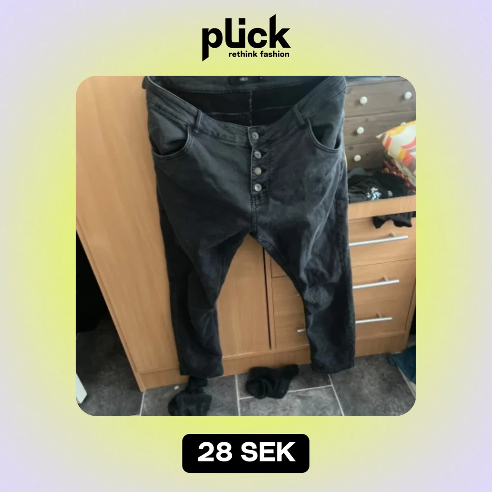 Ett par svarta ”tvättade” jeans från Ellos i storlek 44, ganska korta i benen. Knappar hela vägen upp istället för dragkedja