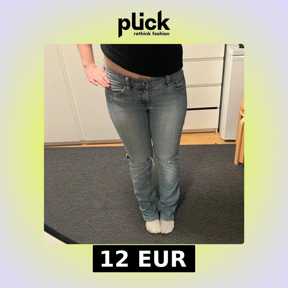 Farkut vastaavat kokoa S/M, ei ole koko lappua. Farkuissa on haaravälissä pieni reikä ja lantion kohdalla saumassa mutta muuten farkuissa ei ole käytönjälkiä.