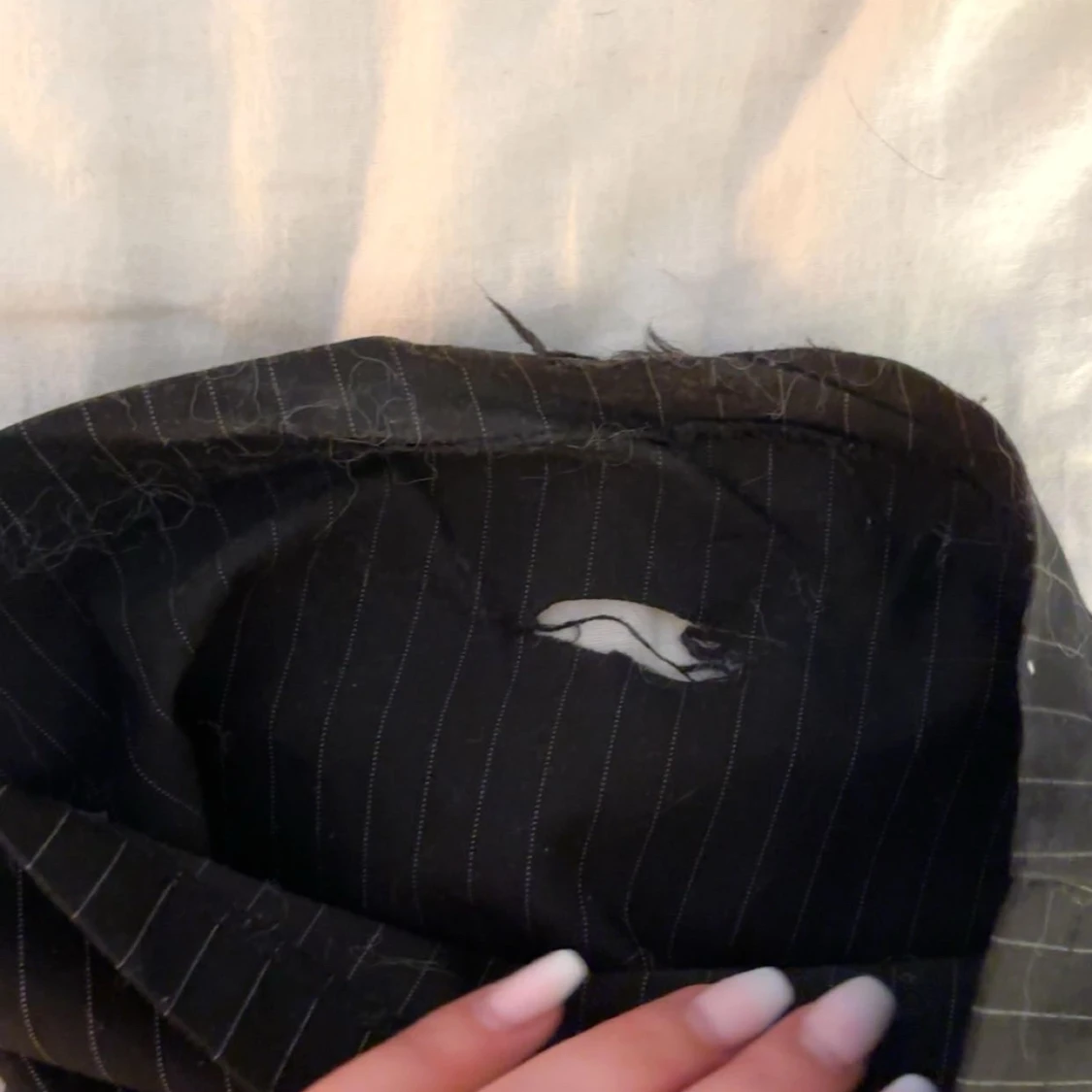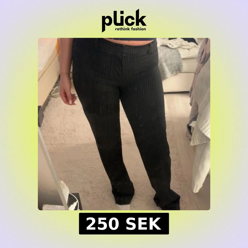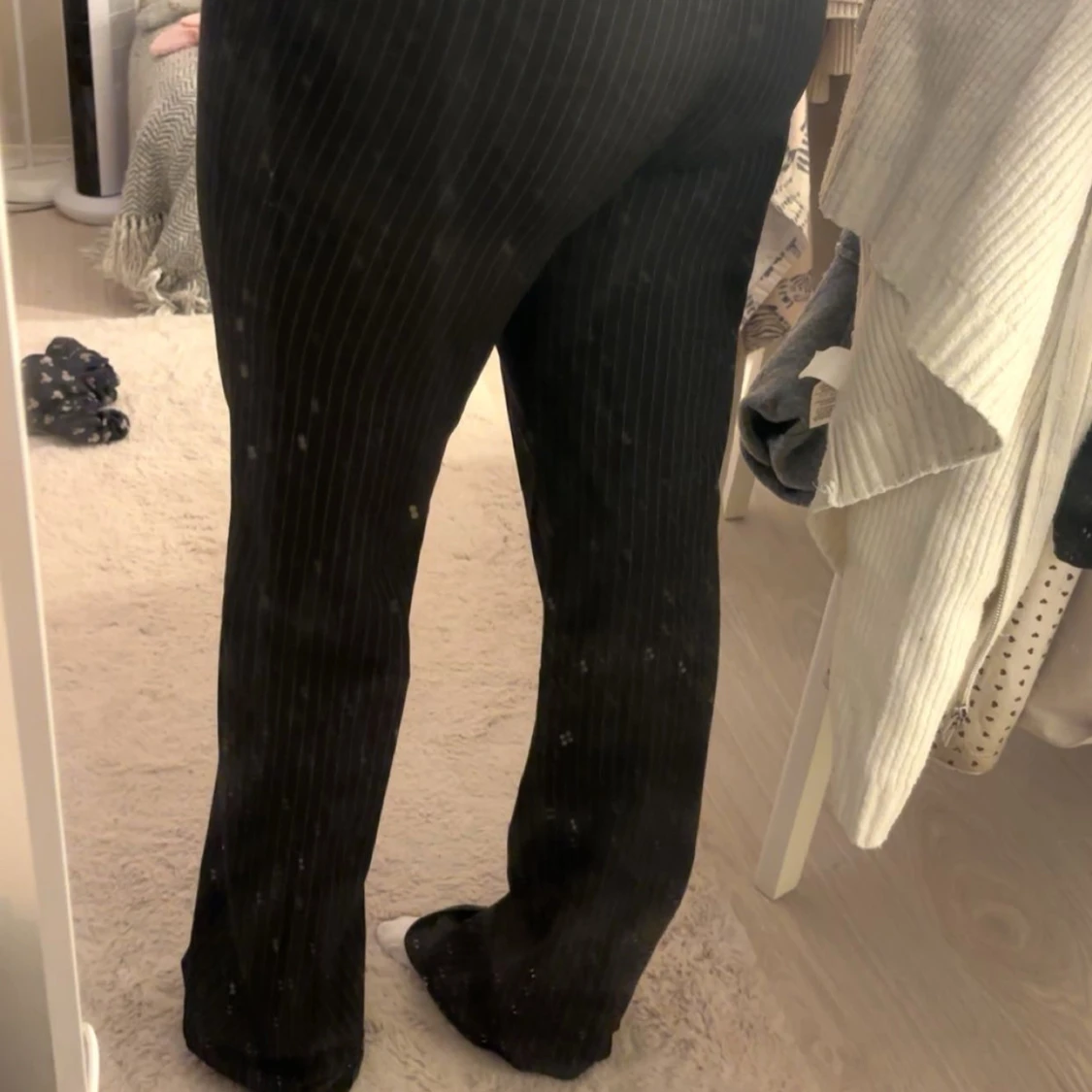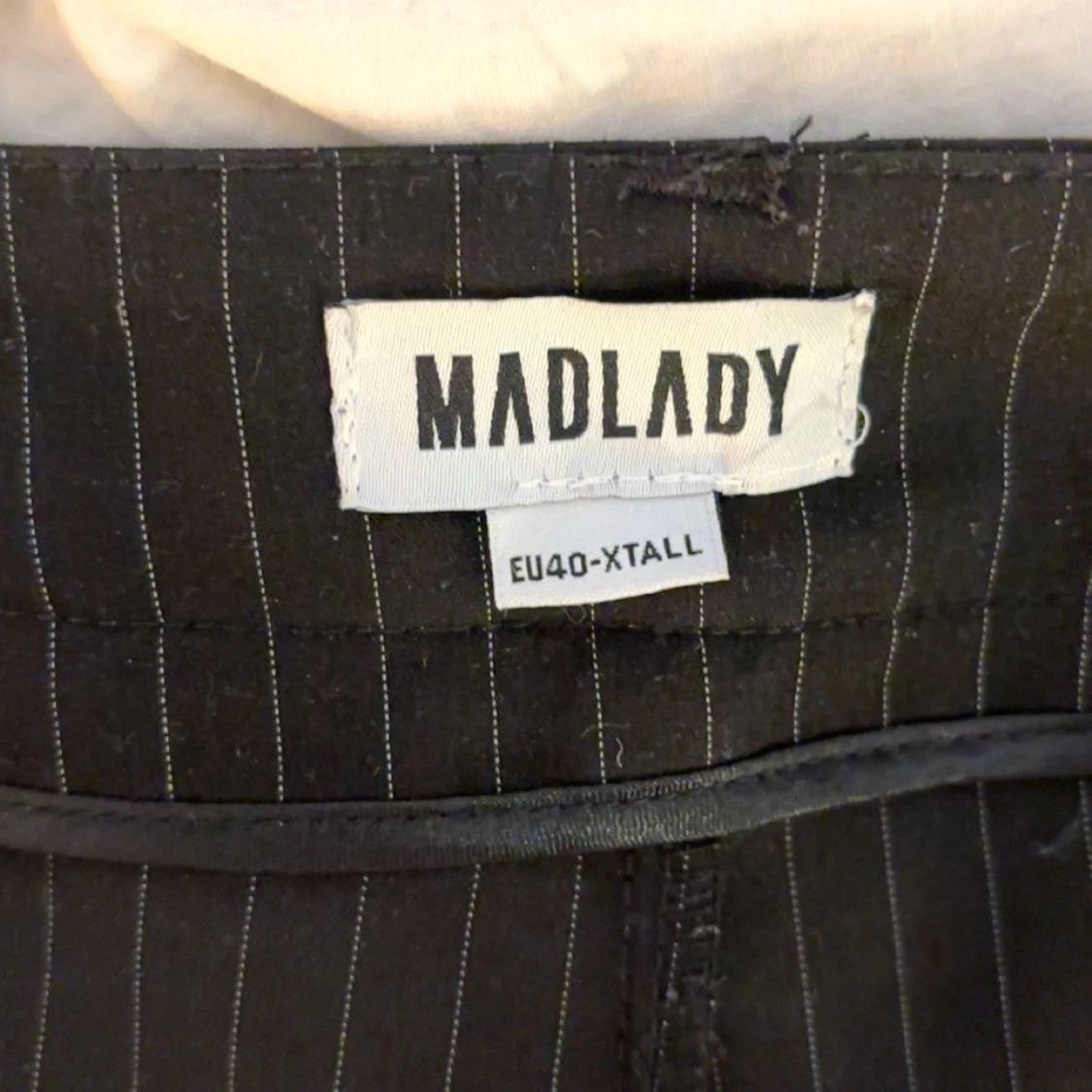 Snygga svarta byxor från Madlady med diskreta ränder. Byxorna är i deras lågmidjade modell och en rak passform som ger en stilren look. Perfekta för en chic och modern stil. Har lite slitningar längst ner vid fötterna.