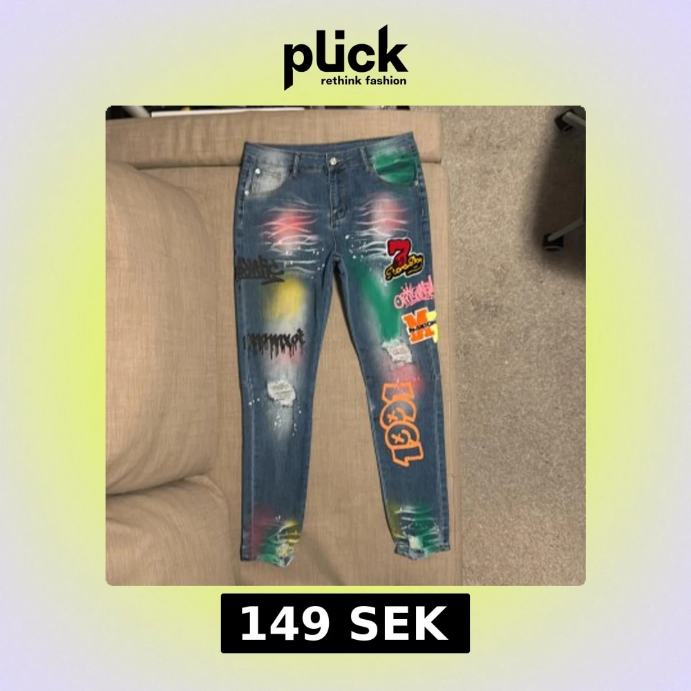 Ett par jeans med färgglada tryck och slitningar. De har en mix av färger som rosa, gul och grön samt olika mönster och textdetaljer. Perfekta för en djärv stil.