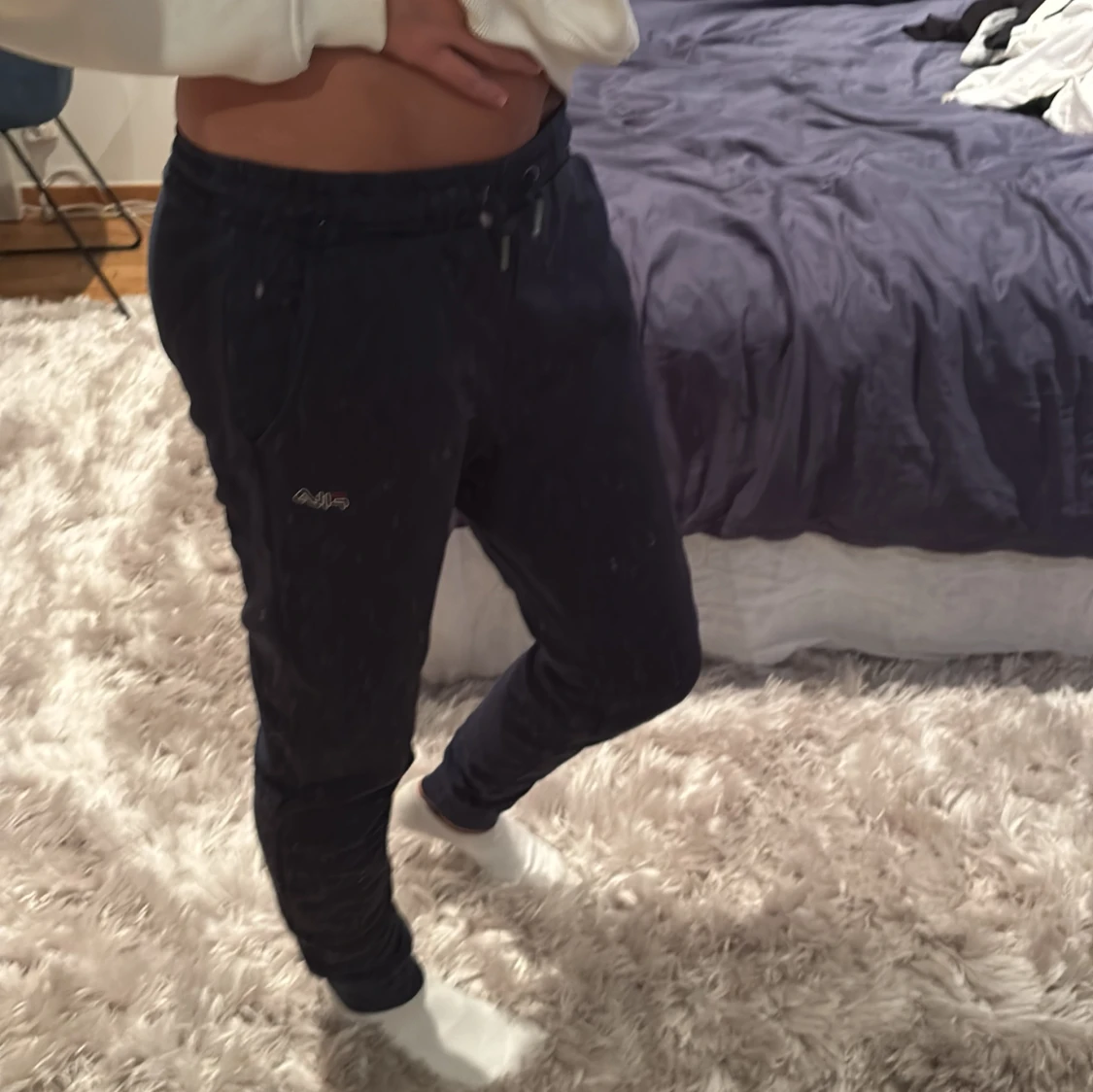 Svarta mjukisbyxor från FILA med dragsko i midjan och smal passform. Byxorna har resår vid bensluten och en liten FILA-logga på ena benet. Perfekta för chill eller träning, tillverkade i mjukt material för maximal komfort.