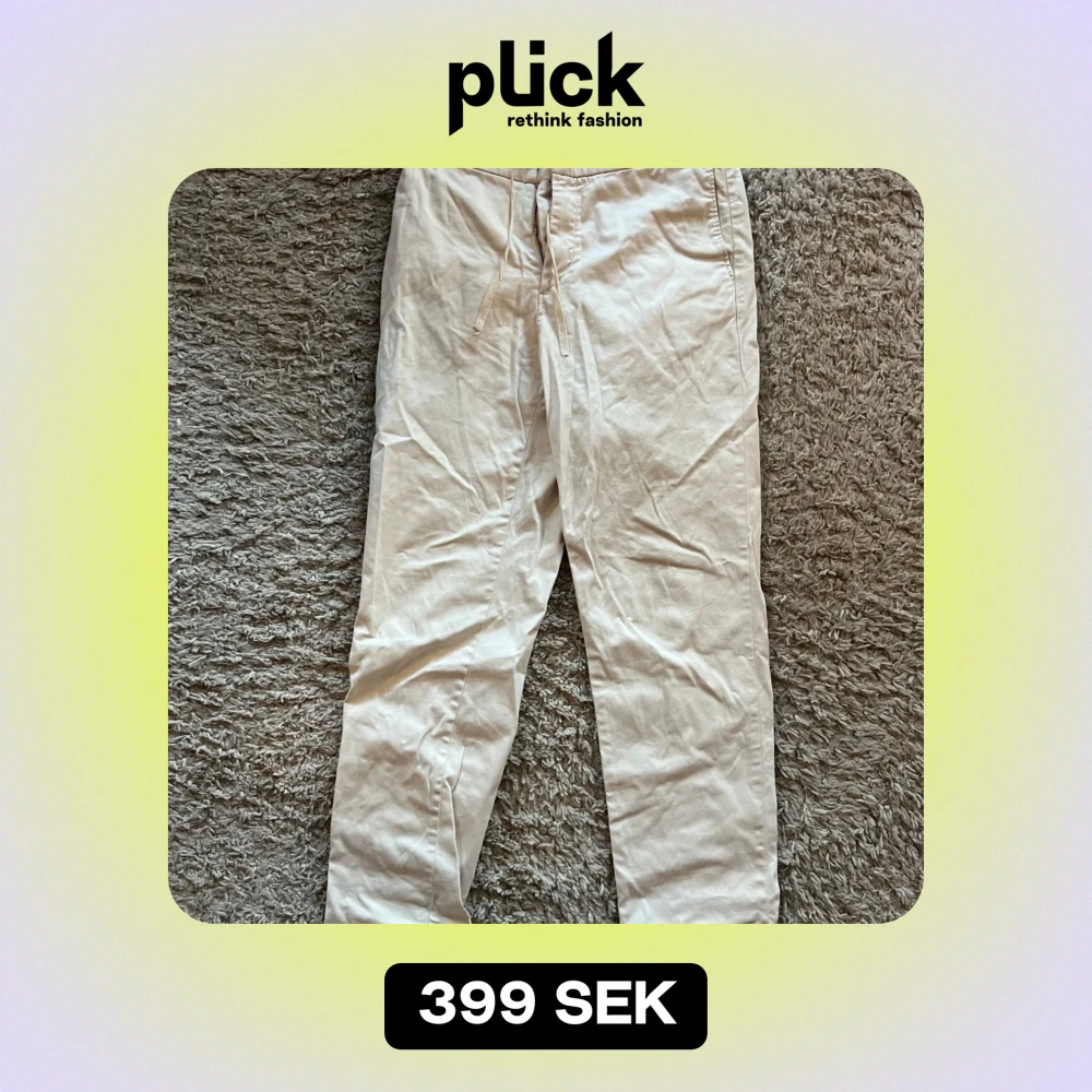 Beige chinos med resår i midjan och dragsko. Byxorna har två fickor framtill och två fickor baktill och är i en rak modell. Storlek 48 Hälsningar// Ludvig