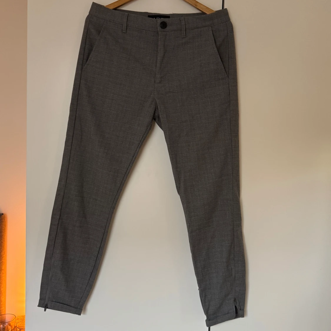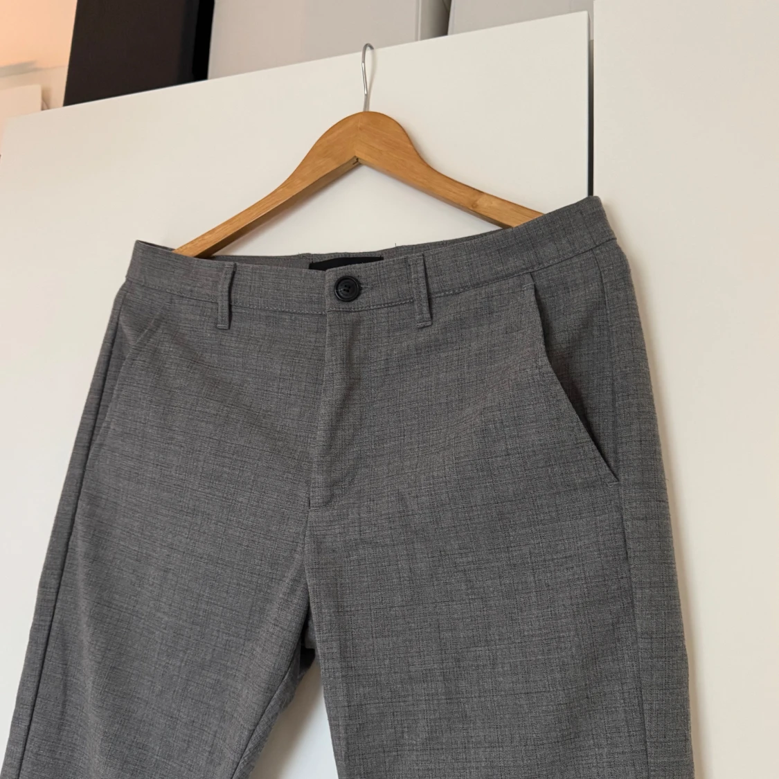 Grå kostymbyxor. Byxorna har en knapp och dragkedja framtill samt fickor på framsidorna. Strl S/M