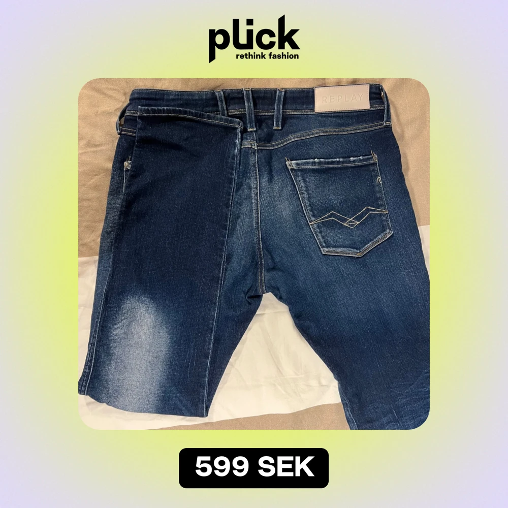 Tjena! Säljer nu ett par av mina replay jeans i en sjukt snygg blå färg som är ljusare vid knäna. Det finns absolut inga hål eller skador på jeansen. Jag har knappt använt dom häller så materialet känns nästan som helt nytt! Kvitto har jag inte kvar, säljer pga av att jag har många blåa jeans. W32 L32 Modellen heter ”Replay Anbass 5 Years Wash Jeans Medium Blue” kostar ca 1600kr nypris