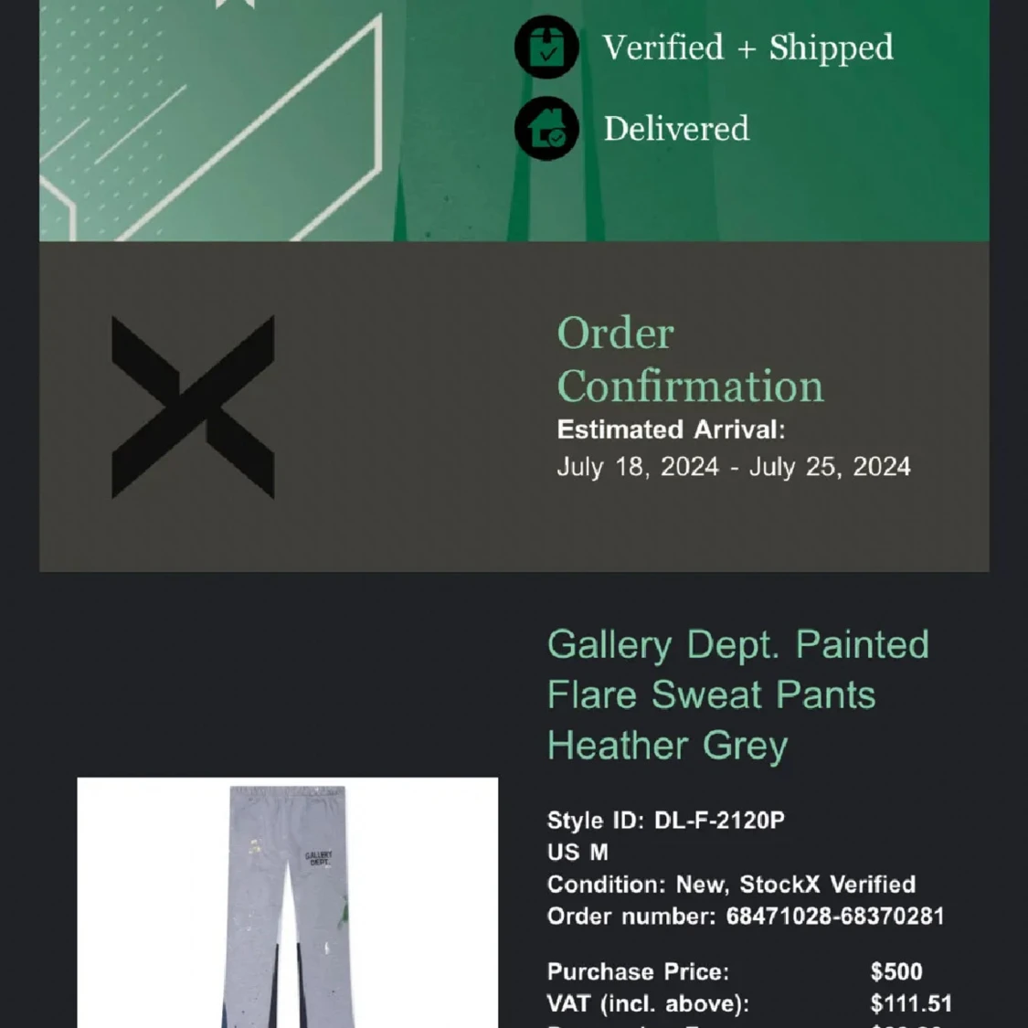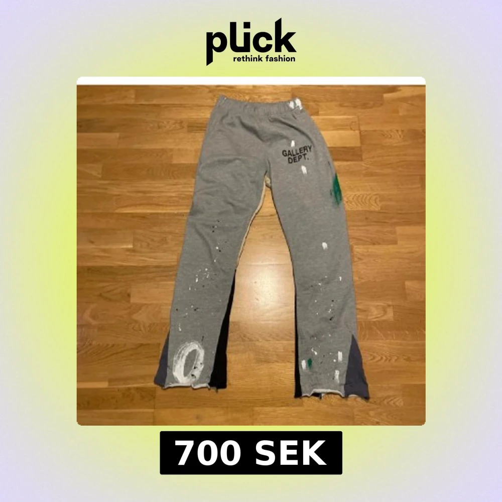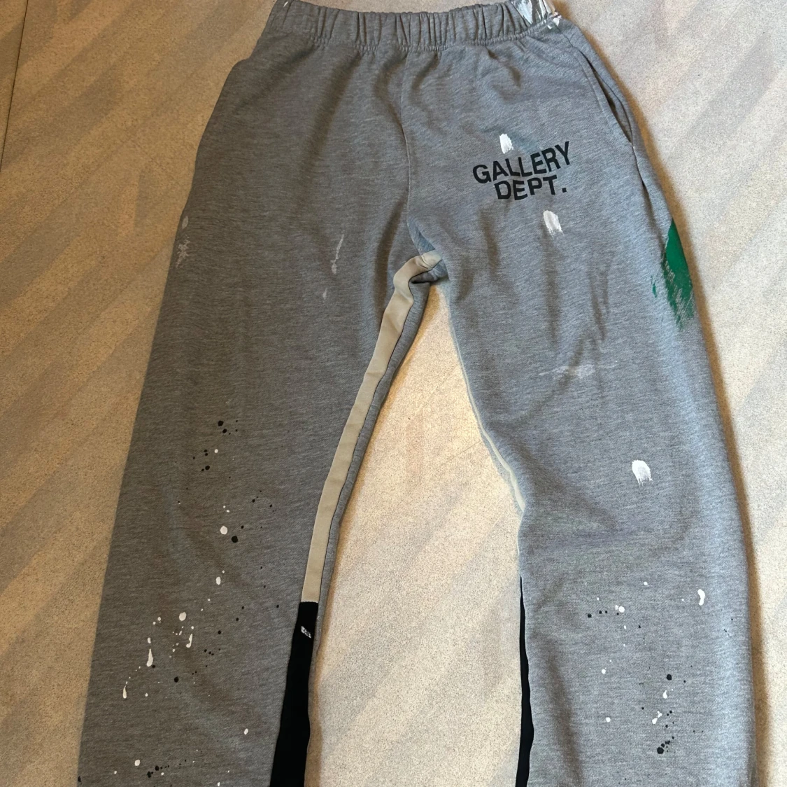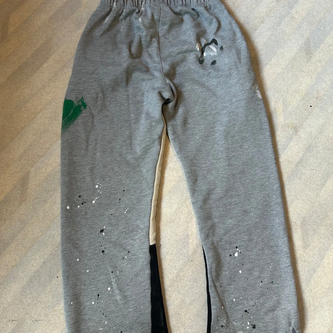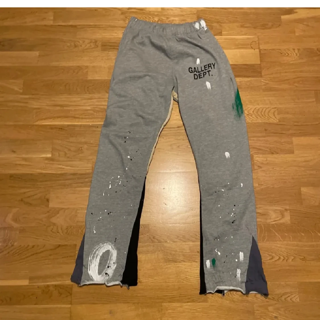 Grå mjukisbyxor från Gallery Dept. med utsvängda ben och färgstänk i vitt och grönt. Byxorna har elastisk midja och tryckt logga på ena låret. Unik design med konstnärlig känsla och råa benslut. Äkta från stockX