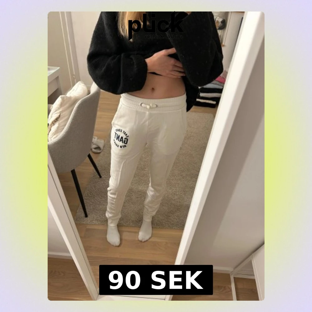 Snygga vita mjukisbyxor från GANT med svart tryck på ena benet. Storlek 158/165. Finns några små fläckar på baksida ben (se sista bilden) men detta är inget som syns så mycket vid användning.