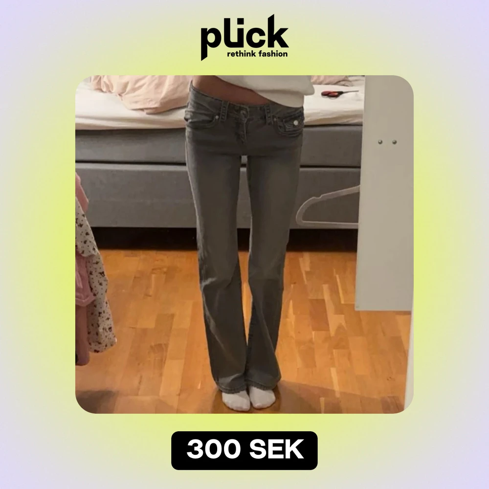 Säljer grå jeans från Gina Young, de är lågmidjade och i nyskick, de är i storlek 152 men ja är 165cm o de går ner till marken