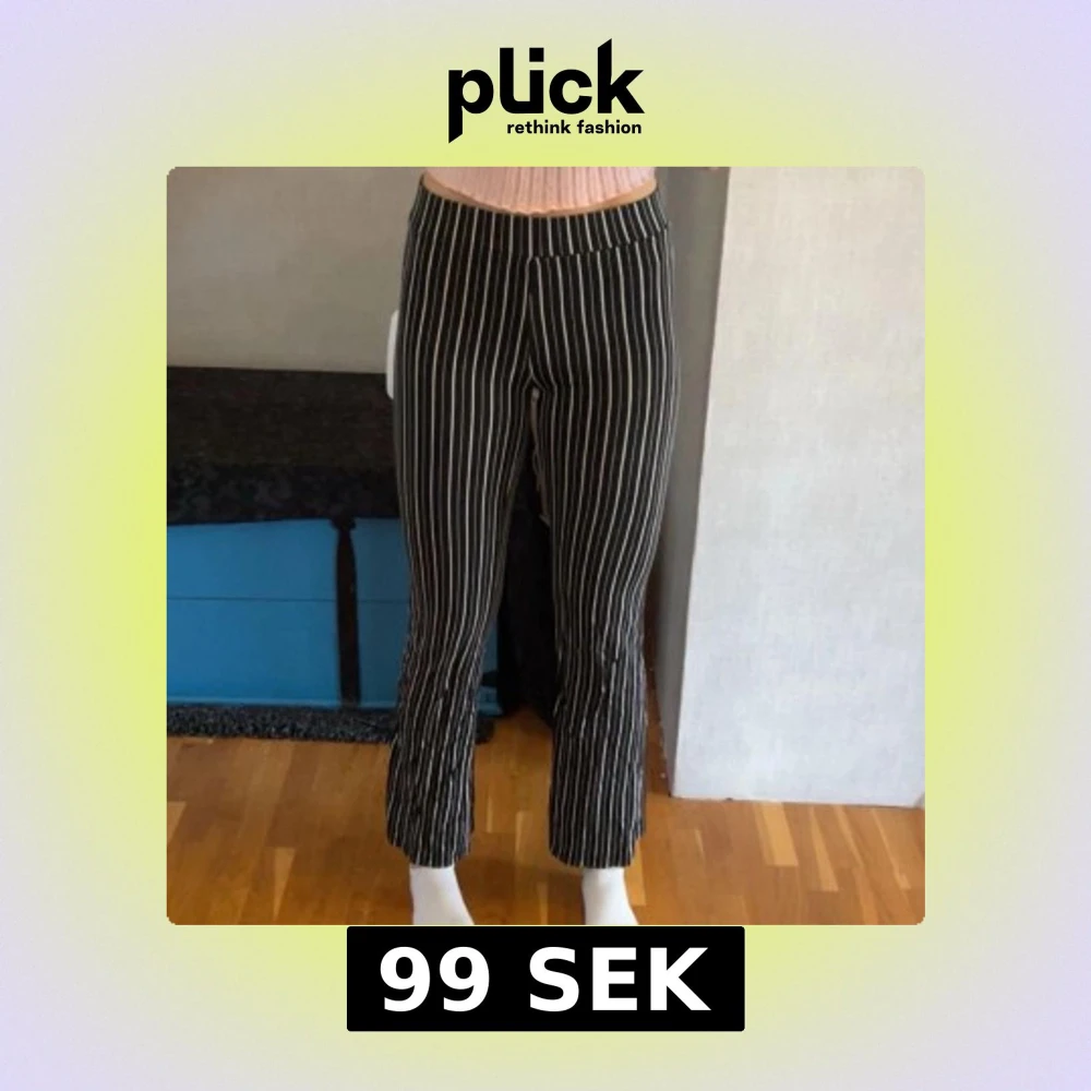 Snygga svarta byxor med vita vertikala ränder från Gina Tricot. Byxorna är korta på mig (jag är 170cm) men bör passa någon som är lite kortare, runt 160-165cm. De är utsvängda i benen. Tillverkade av 97% viskos och 3% elastan, de är mjuka och stretchiga.💕