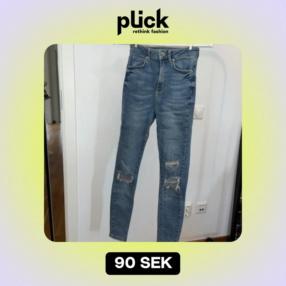 Ljusblåa jeans från Gina med håll i knäna, super fin ljusblå jeans färg. Slim jeans. Storlek 34, dom är väldigt stretchiga och sköna i materialet.