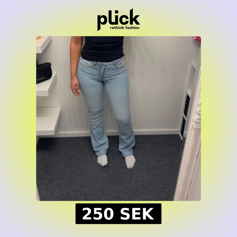 Säljer ett par ljusblå jeans med bootcut-modell. Byxorna har klassisk femficksdesign, medelhög midja och är tillverkade i mjukt denimtyg. Perfekta för dig som gillar en retro vibe och vill ha ett par jeans som sitter snyggt över höfterna och släpper ut vid benen. I storlek 170 men sitter som en xs/s