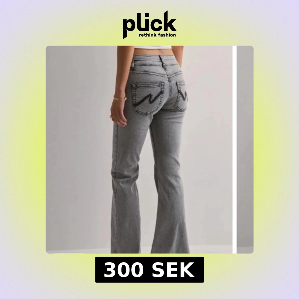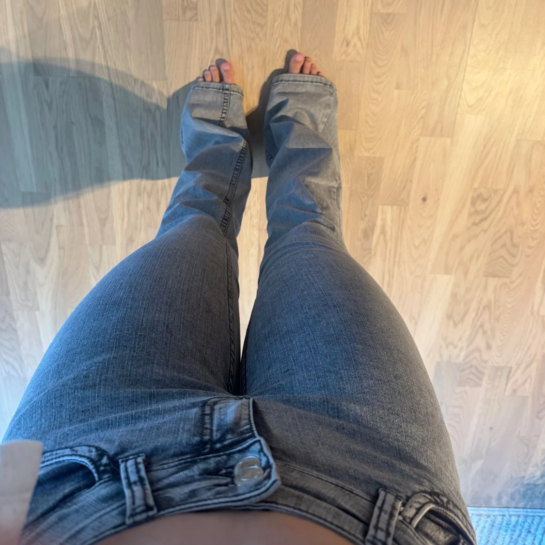 Säljer ett par grå bootcut jeans med snyggt svart broderi på bakfickorna. Jeansen har medelhög midja, klassisk femficksdesign och är tillverkade i mjukt denimtyg. Perfekta för dig som gillar en retro vibe och vill ha ett par jeans som sticker ut.
