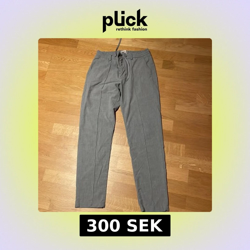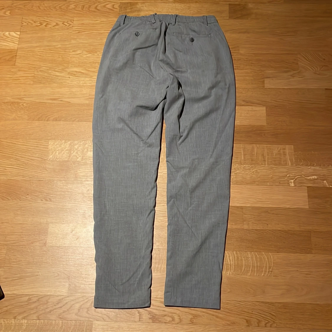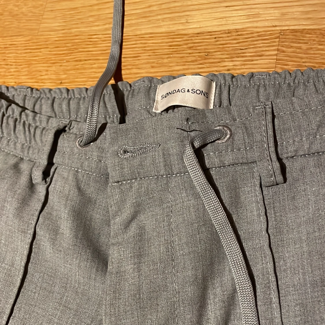 Snygga grå byxor med snörning i midjan från Søndag & Sons. Byxorna har en rak passform och är perfekta för en stilren look. De har diskreta fickor och knappar bak för extra detaljer. Storlek 31/32