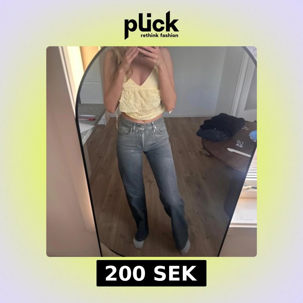 Långa straight/baggy högmidjade jeans. Grå glittriga från Zara. Sitter skit najs . Jag är 173