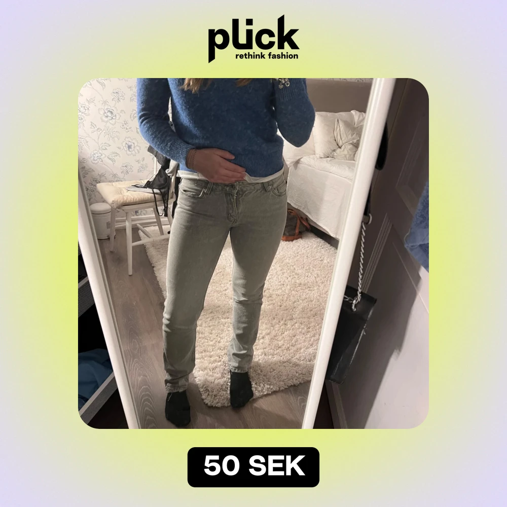 Gråa lågmidjade jeans. Snygg passform. Sitter bra på mig som är 1,62 cm. Har ett mindre hål men det går att sy.