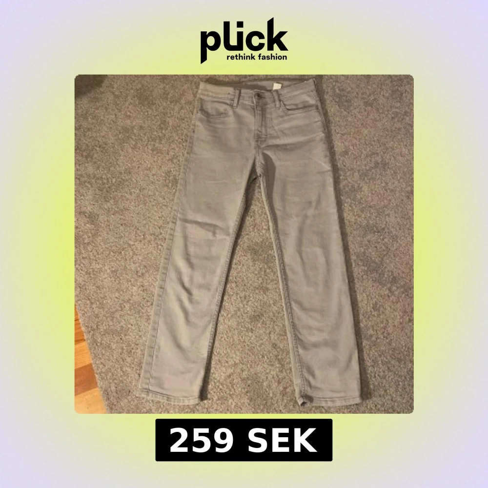 Snygga grå slim fit byxor från H&M med justerbar midja. Perfekta för en stilren look. Byxorna har en klassisk design med fem fickor och dragkedja.