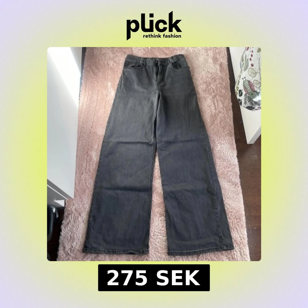 Säljer ett par gråa jeans från Lindex med breda ben och klassisk femficksdesign. Jeansen har hög midja och raka, vida ben för en avslappnad och trendig look. Perfekta att styla med sneakers eller boots.