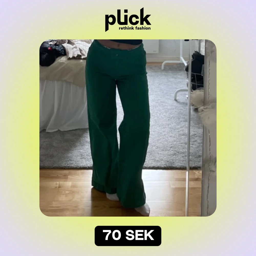 Gröna jeans - Säljer då dom inte kommer till användning🫶🏻 populära och efterteaktade gröna jeansen från hm🩷(lånade bilderk) skulle vilja sägs dom e små i storleken så dom passar även 34. Som är lite sönder längst nere på ena benet men inget som syns