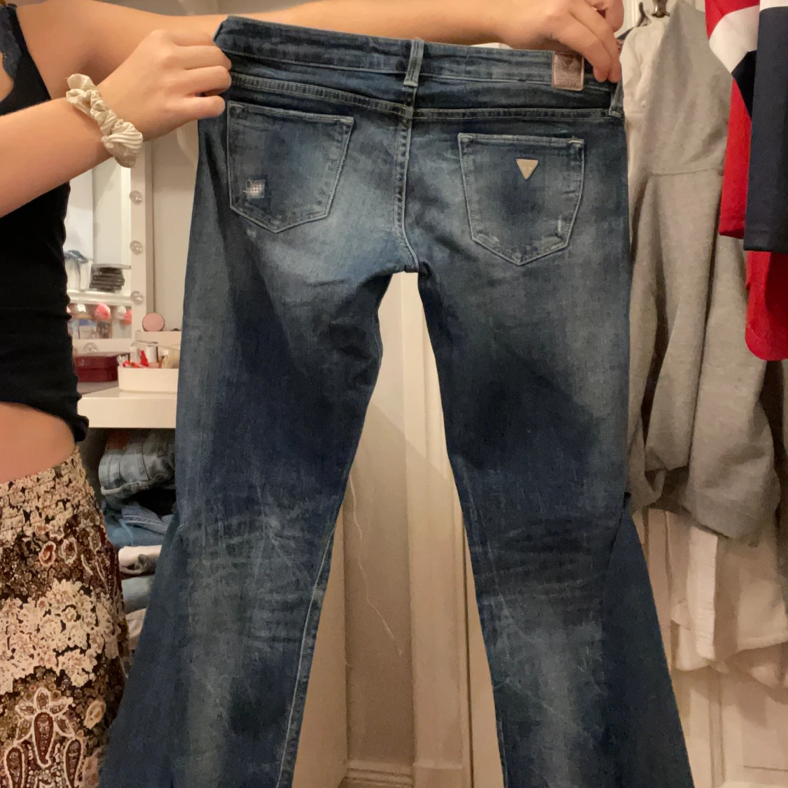 Säljer dessa mörkblå lågmidjade jeans från guess som är omsydda till bootcut. Jeansen har lite slitningar på benen och jag har sprättat upp de längst mer så att de skulle bli längre. Midjemått 36 cm tvärs över midjan och innerbenslängd 71 cm💗💗