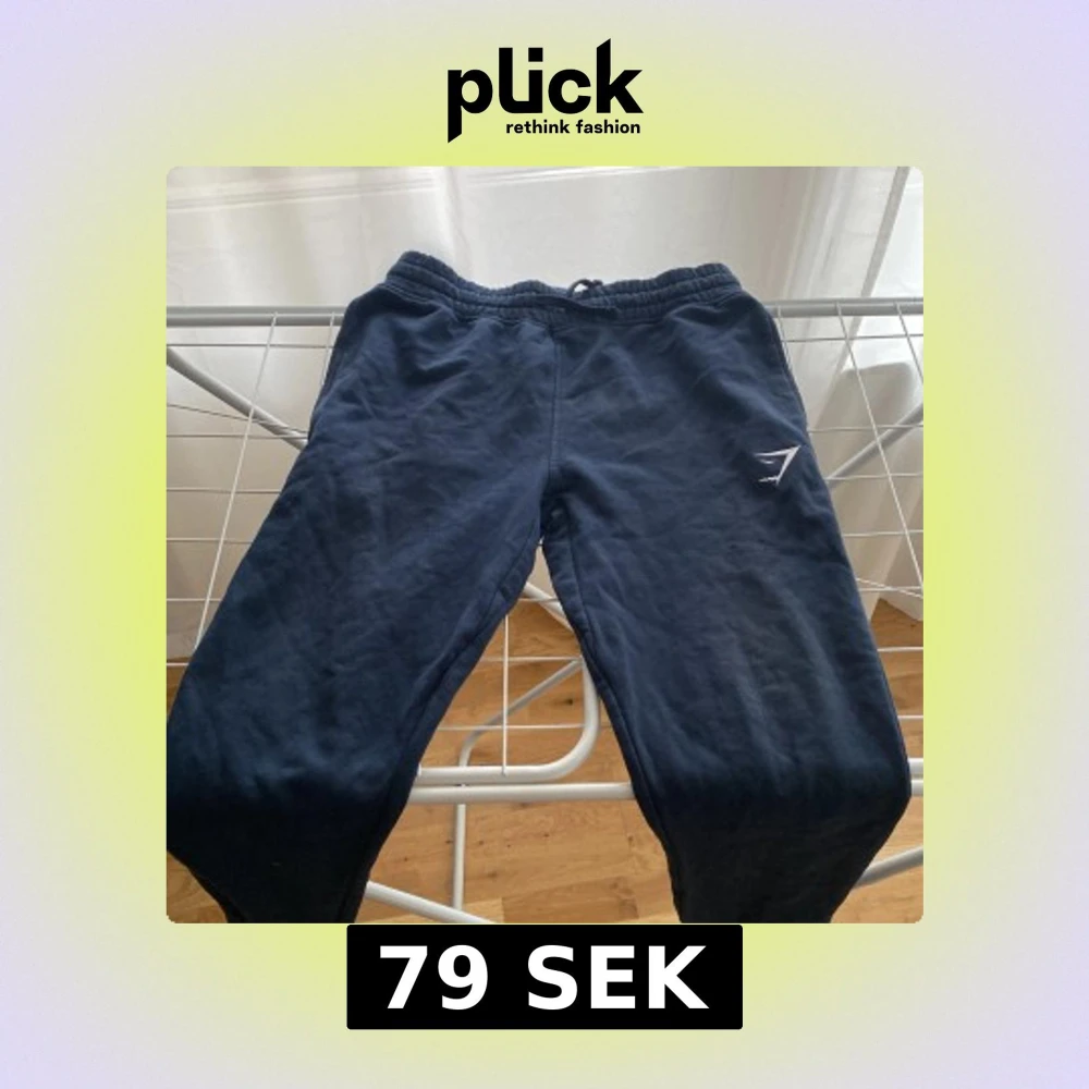 Säljer ett par svarta mjukisbyxor från Gymshark. Byxorna har en elastisk midja med snörning och en liten logotyp på benet. Perfekta för en avslappnad dag eller träning. Använda Max 2/3 ggr!