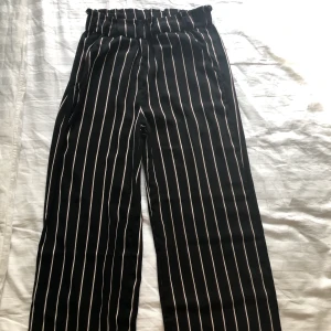 Svarta byxor med vinröda och vita ränder. Sitter lite tajtare runt rumpa/lår vida ner till. Resår i midjan, fickor fram. Bekväma och snygga byxor.