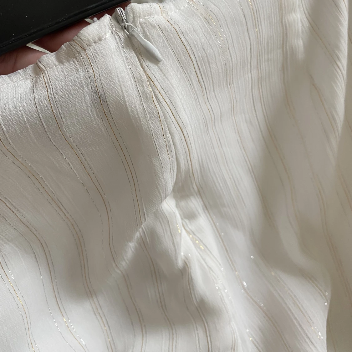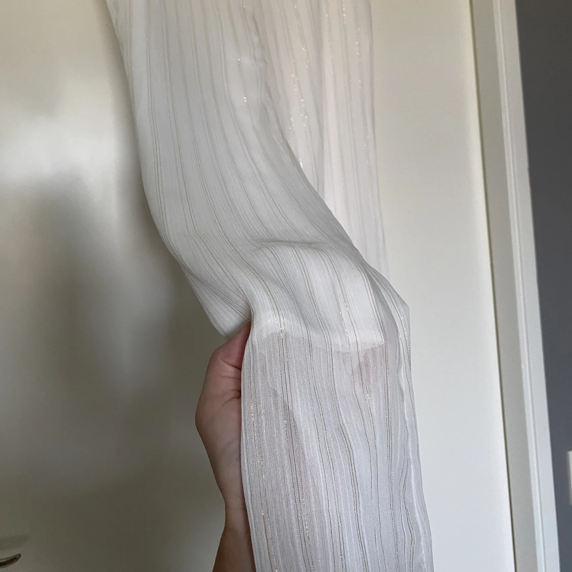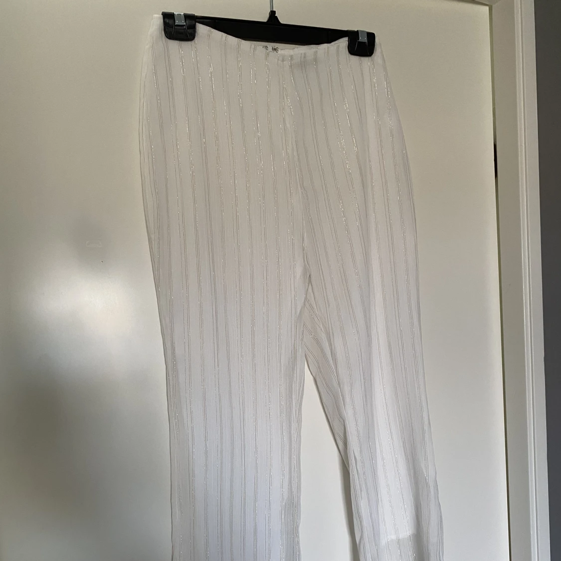 Hur fina är inte dessa tunna vita byxor med skimriga ränder? ✨ Finbyxa som passar lika bra till fest/middag eller midsommar för dig som inte gillar klänning! Använda 1 gång. Kommer tyvärr inte i dem annars hade jag behållt dem. Kom med prisförslag 😊