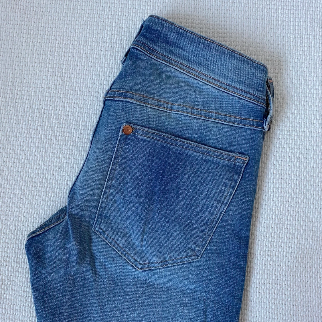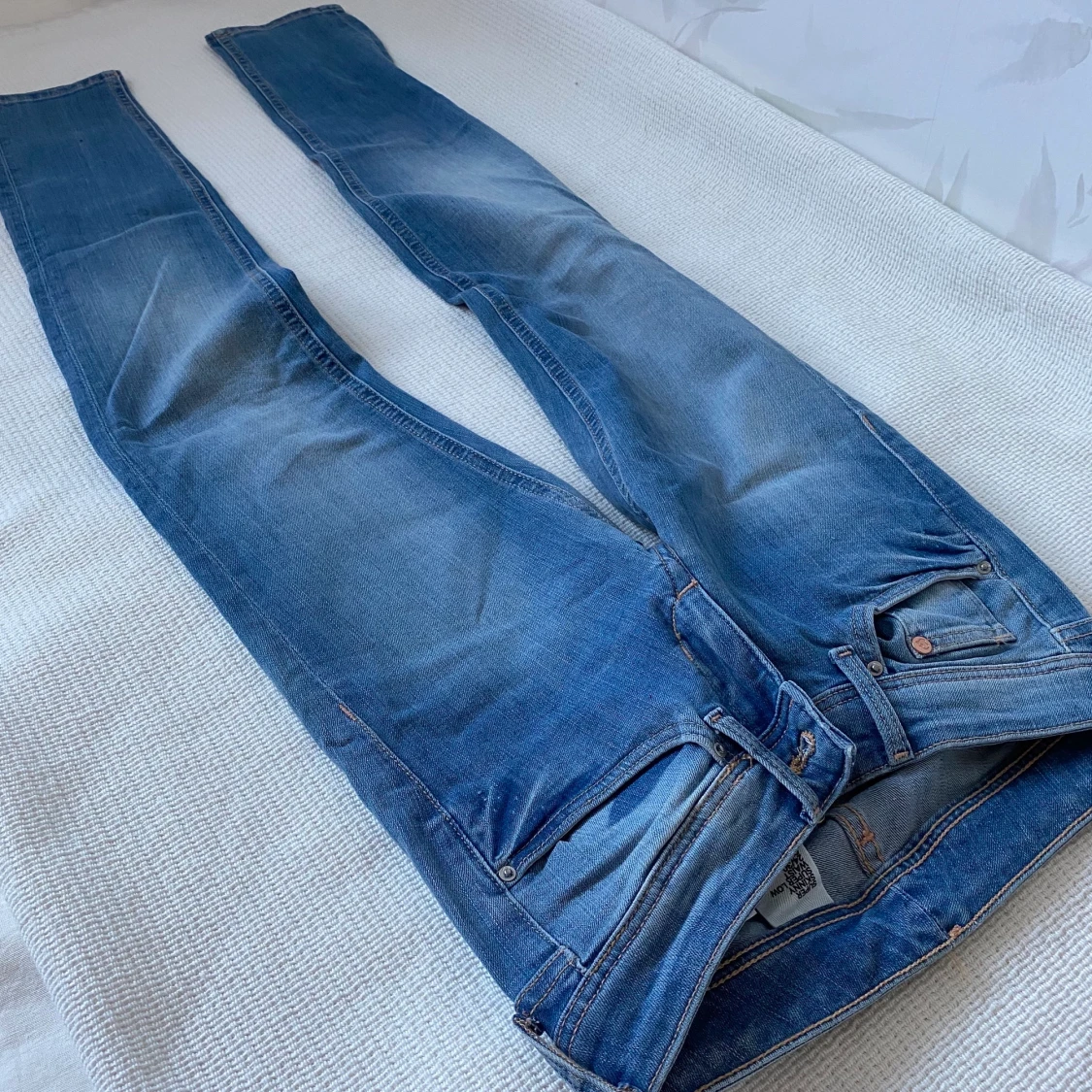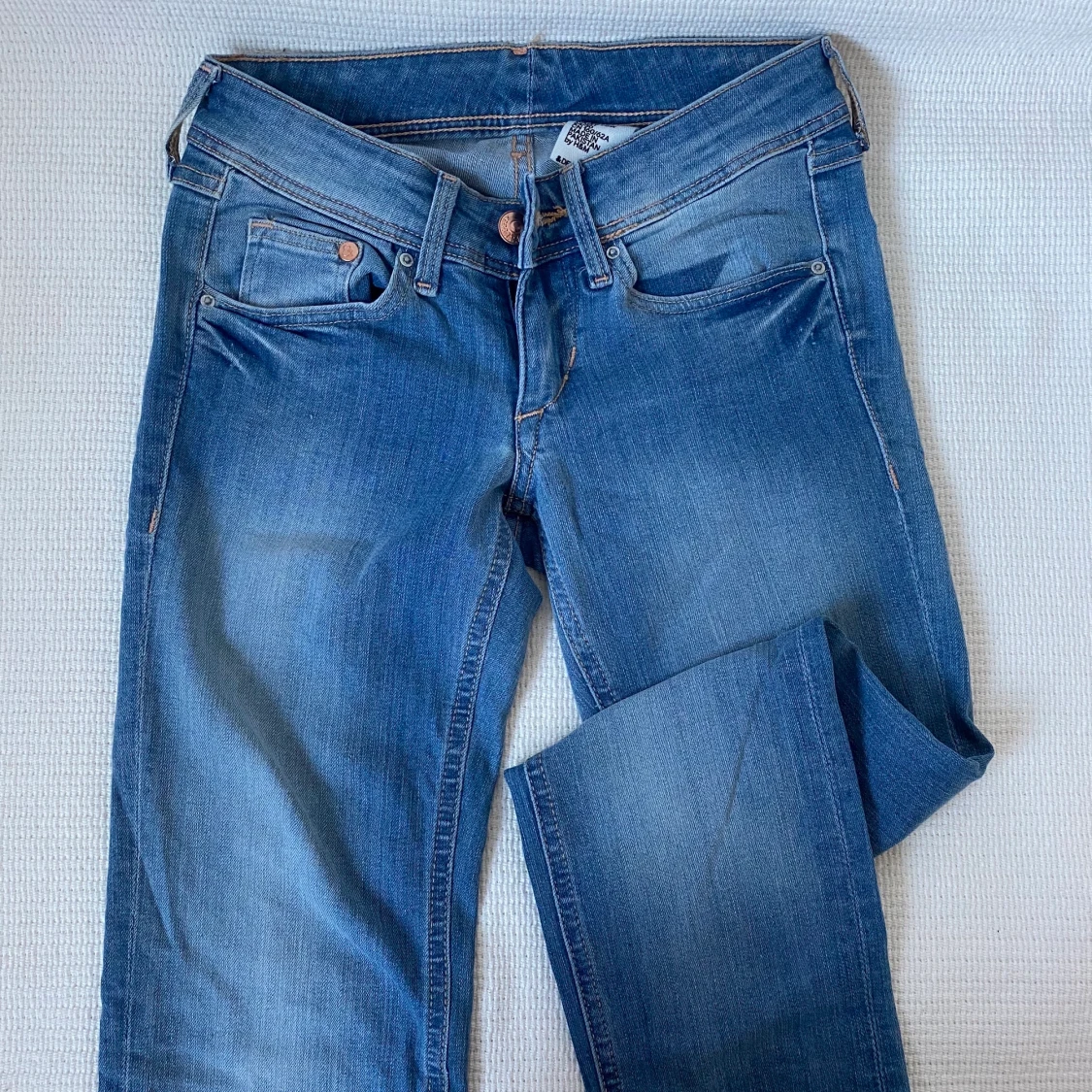 Skitsnygg färg på dessa jeans från hm! Aldrig använda! Storlek 24/30. Midjan är extra låg, supersnyggt på!