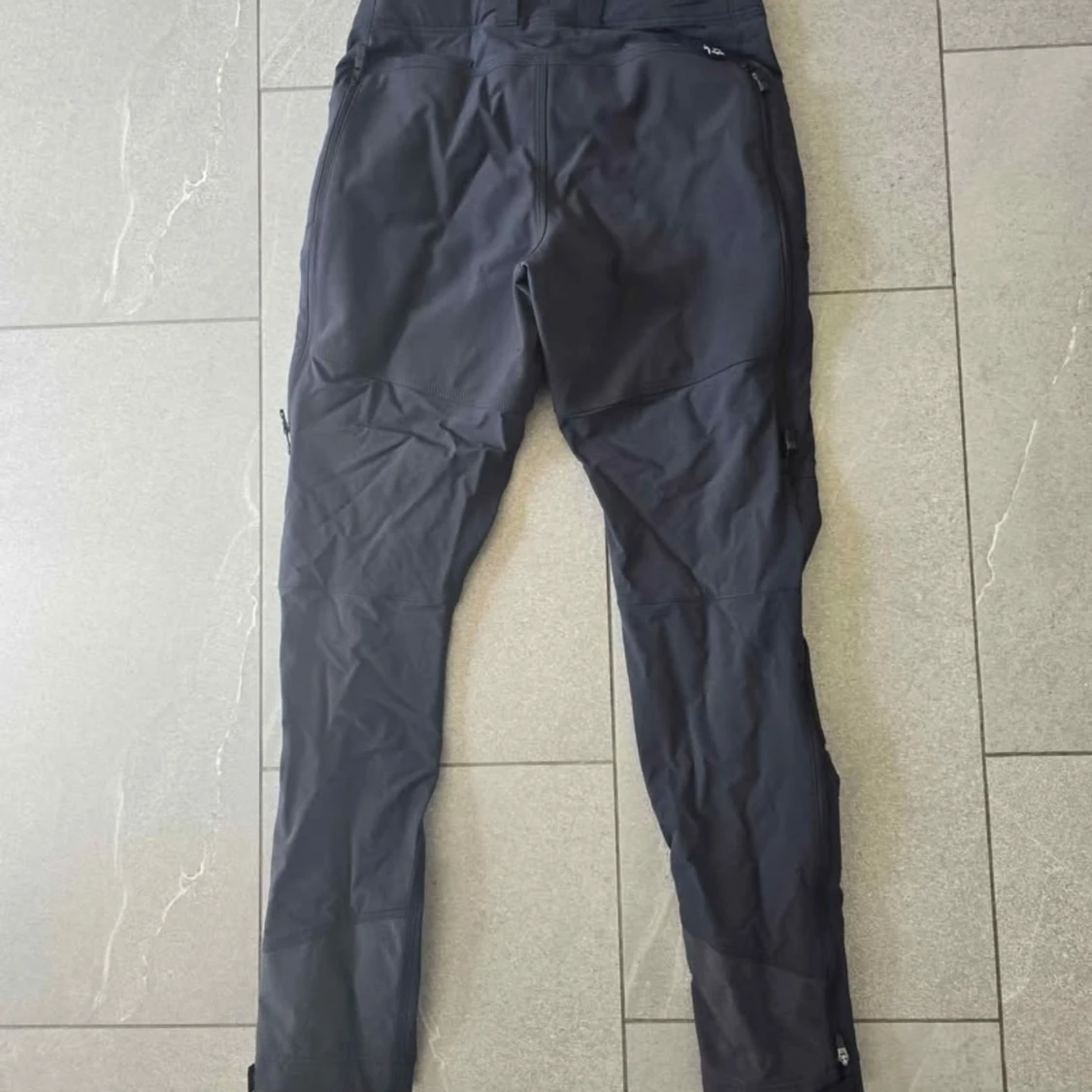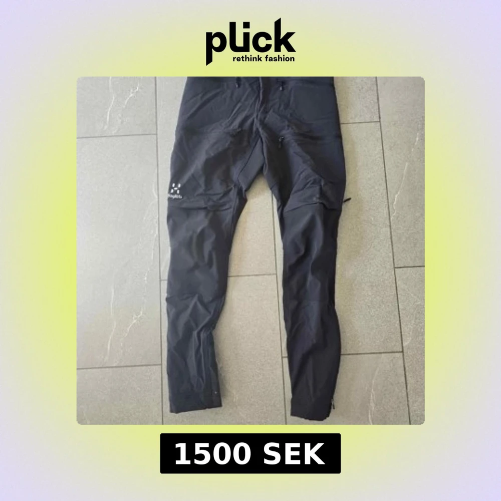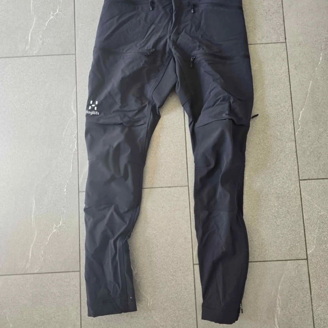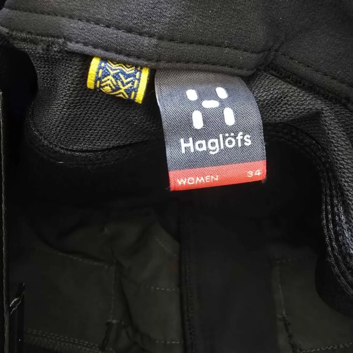 Svarta friluftsbyxor från Haglöfs i dammodell med flera dragkedjeförsedda fickor och smal passform. Byxorna är tillverkade i slitstarkt syntetmaterial och har diskret logga på låret. Perfekta för utomhusaktiviteter och äventyr. Använda 1 gång vid regn