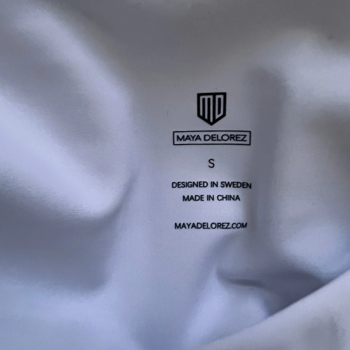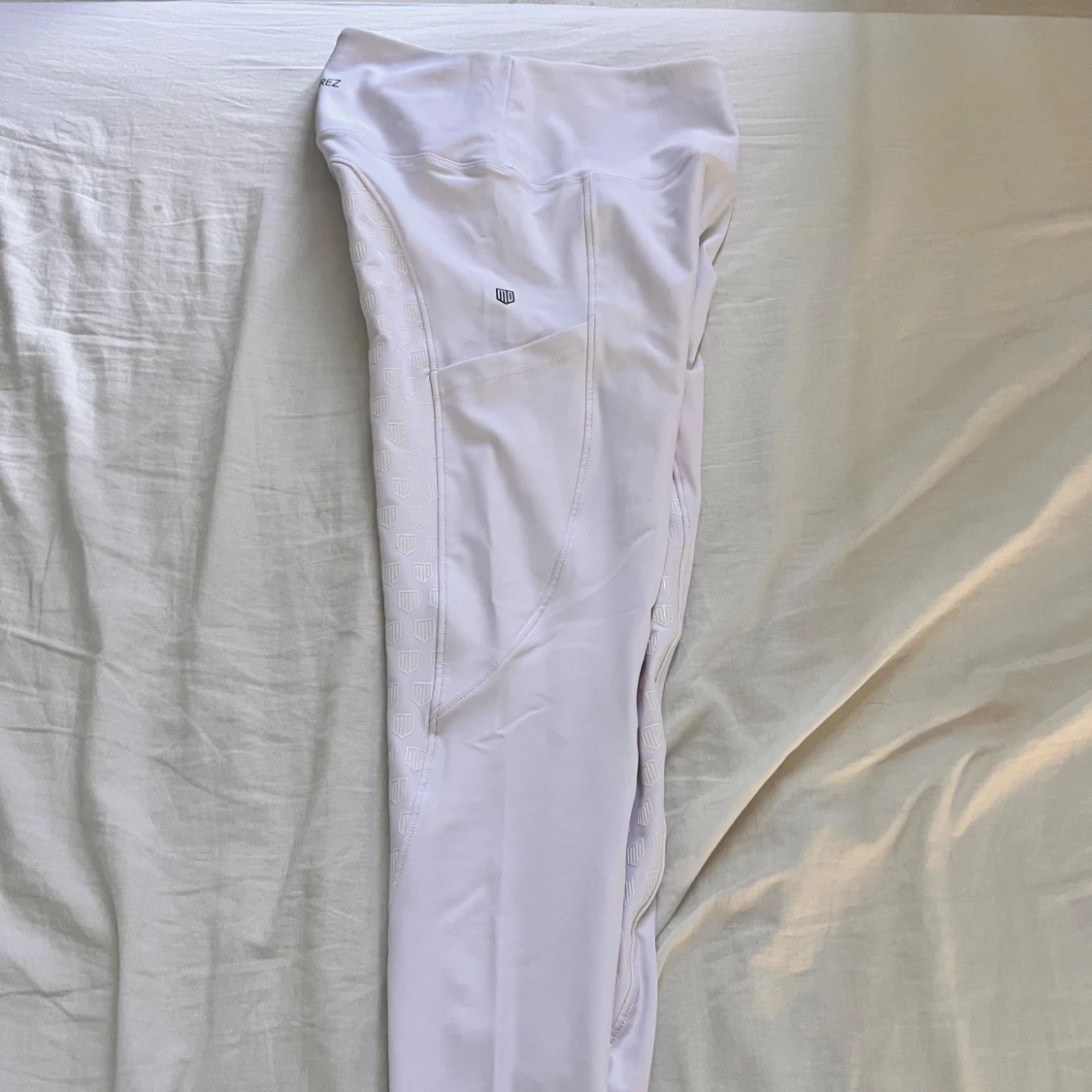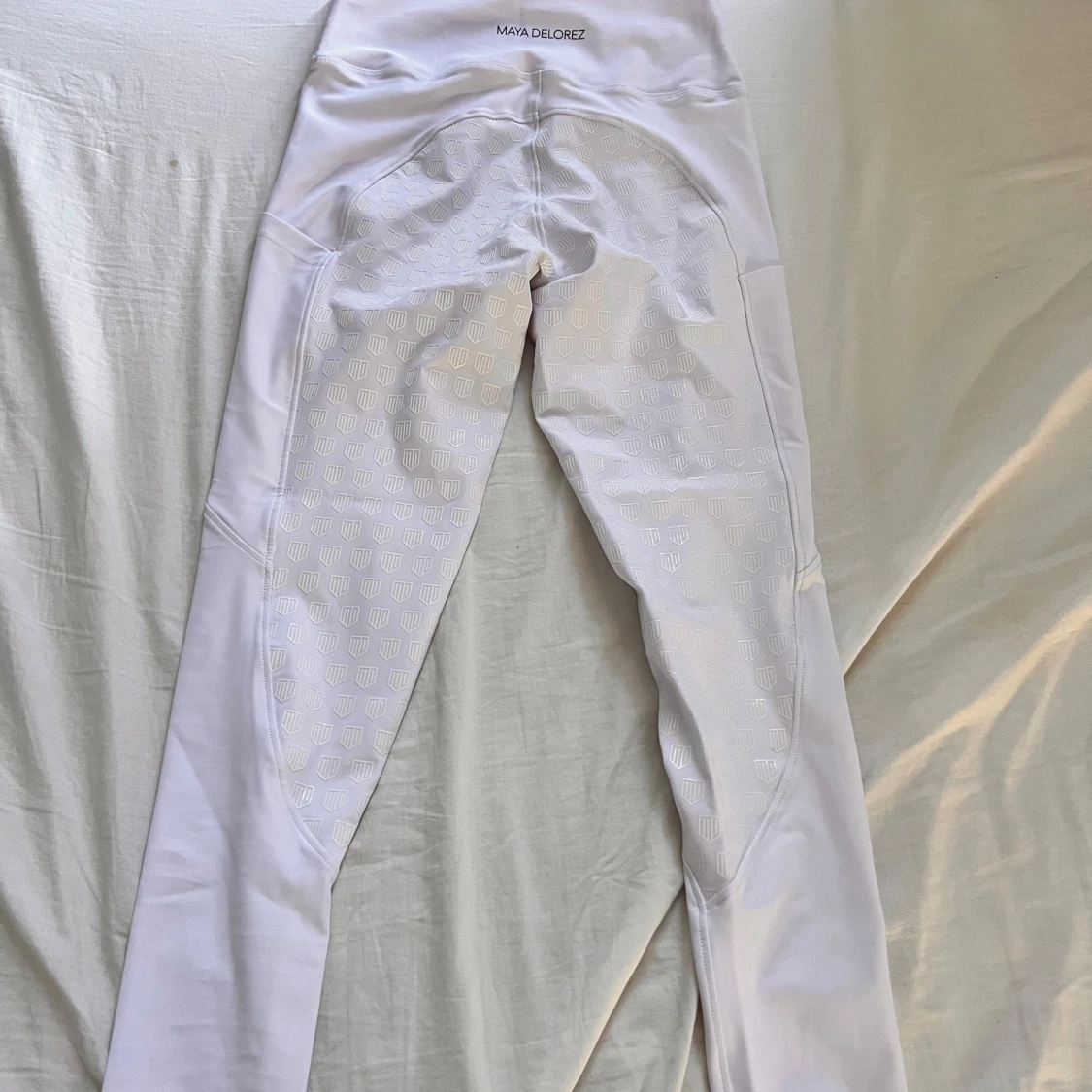 Snygga vita ridleggings från Maya Delorez med silikonmönster för extra grepp. Stretchigt och bekvämt material som sitter tajt och har praktiska fickor på sidorna. Perfekta för dig som vill ha stil och funktion i stallet. Mycket bekvämare så man presterar bättre på tävling. Helt nya original pris 800 tror jag