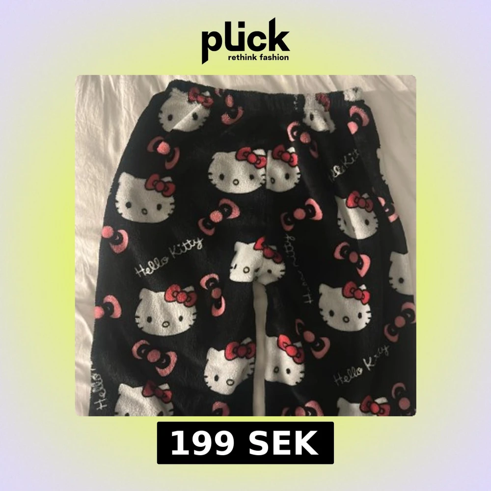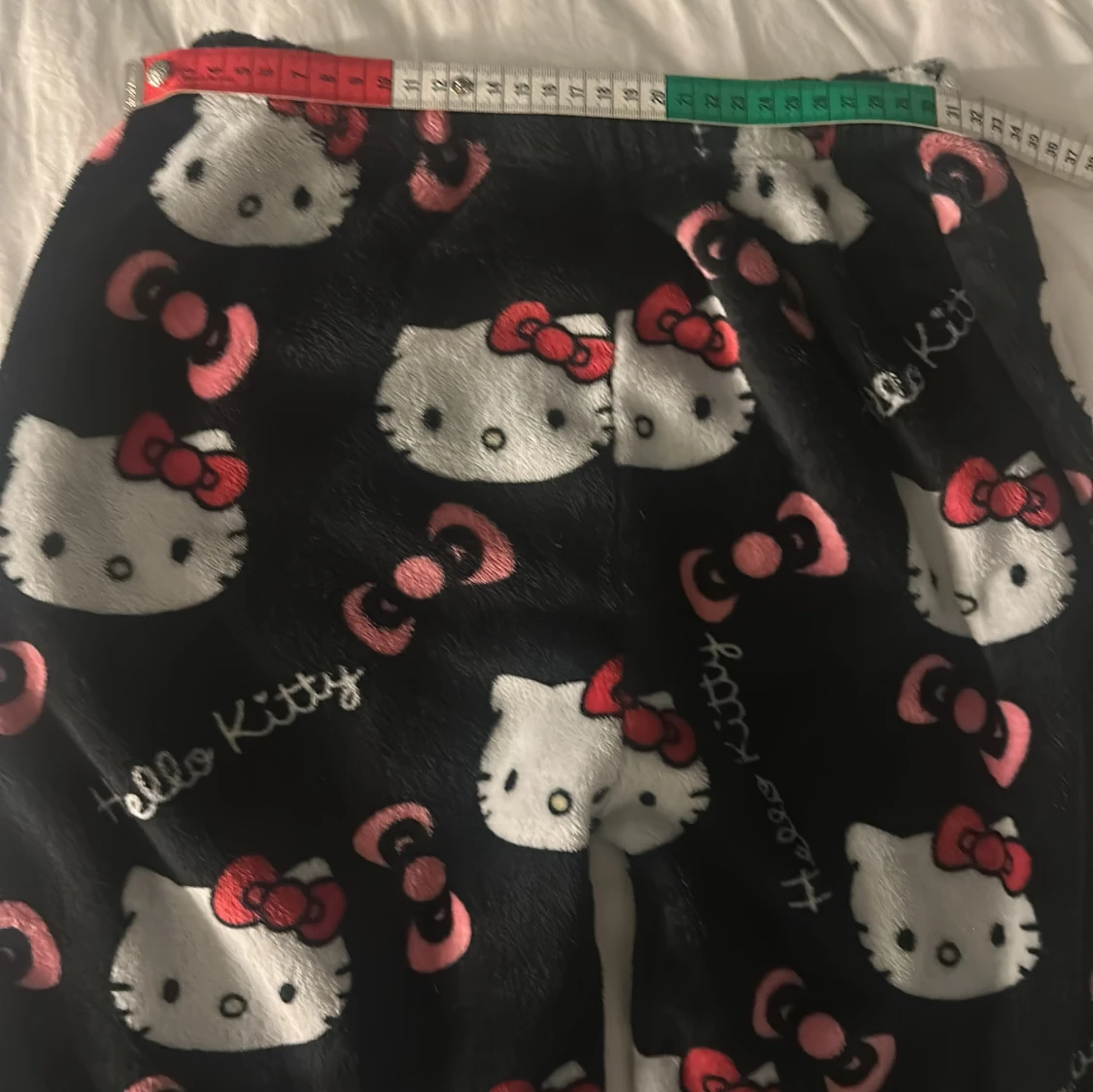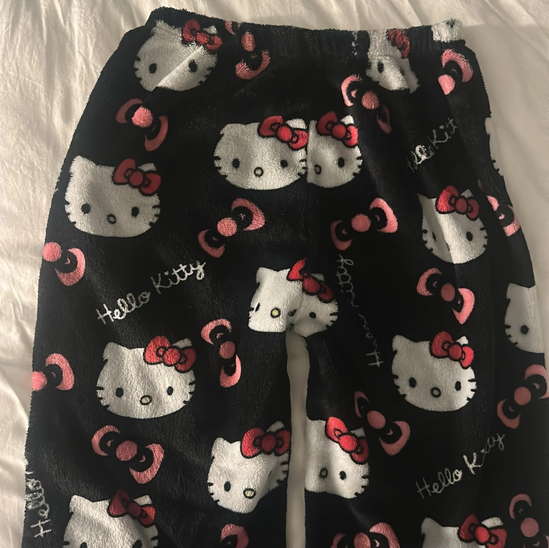 Supermysiga svarta mjukisbyxor med Hello Kitty-tryck och rosa rosetter över hela. Byxorna har elastisk midja.