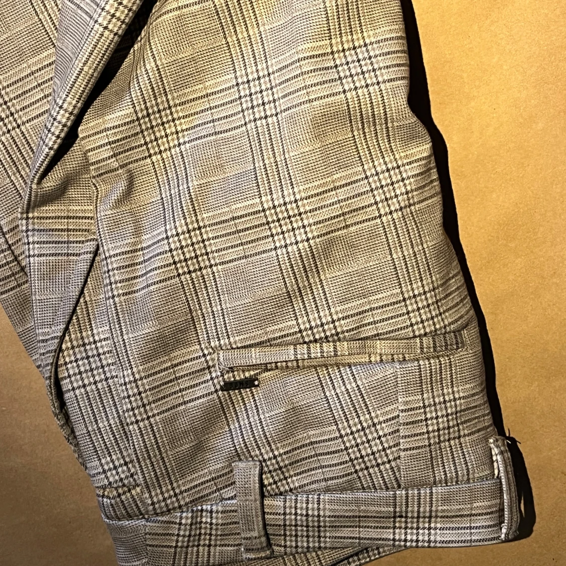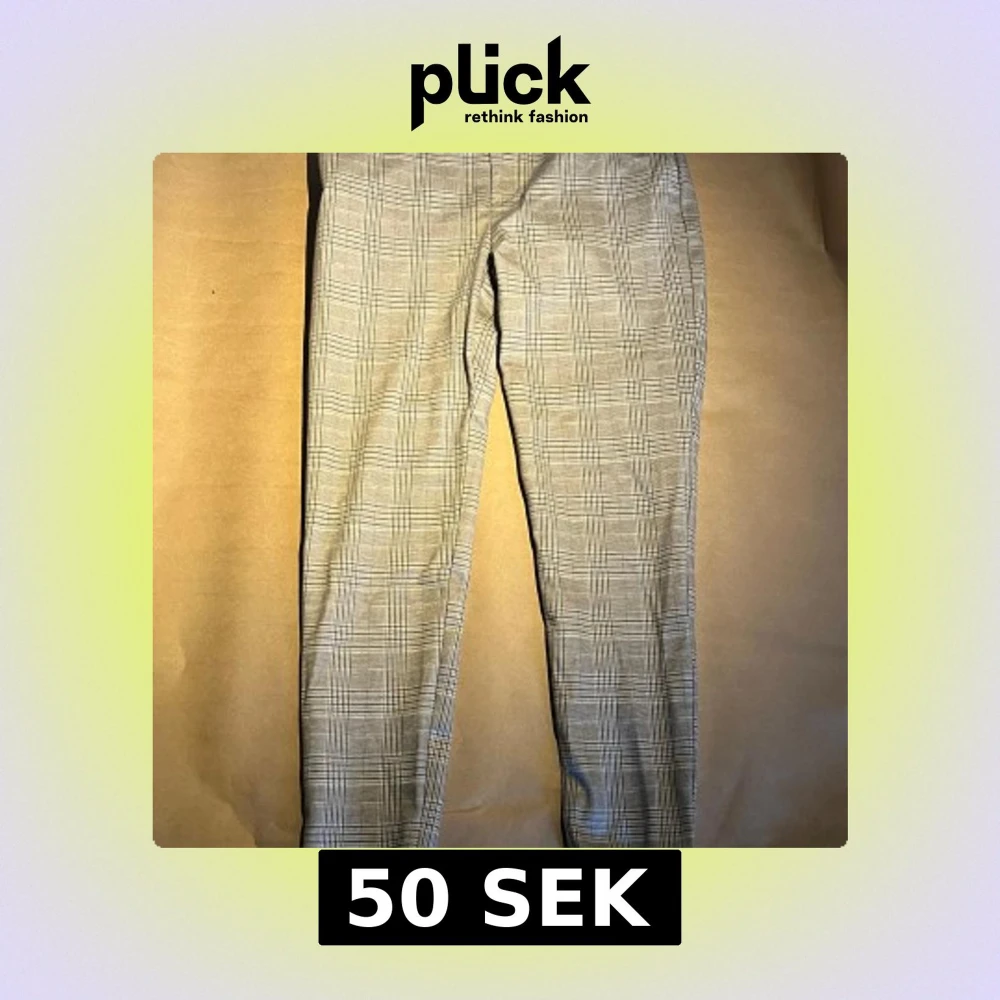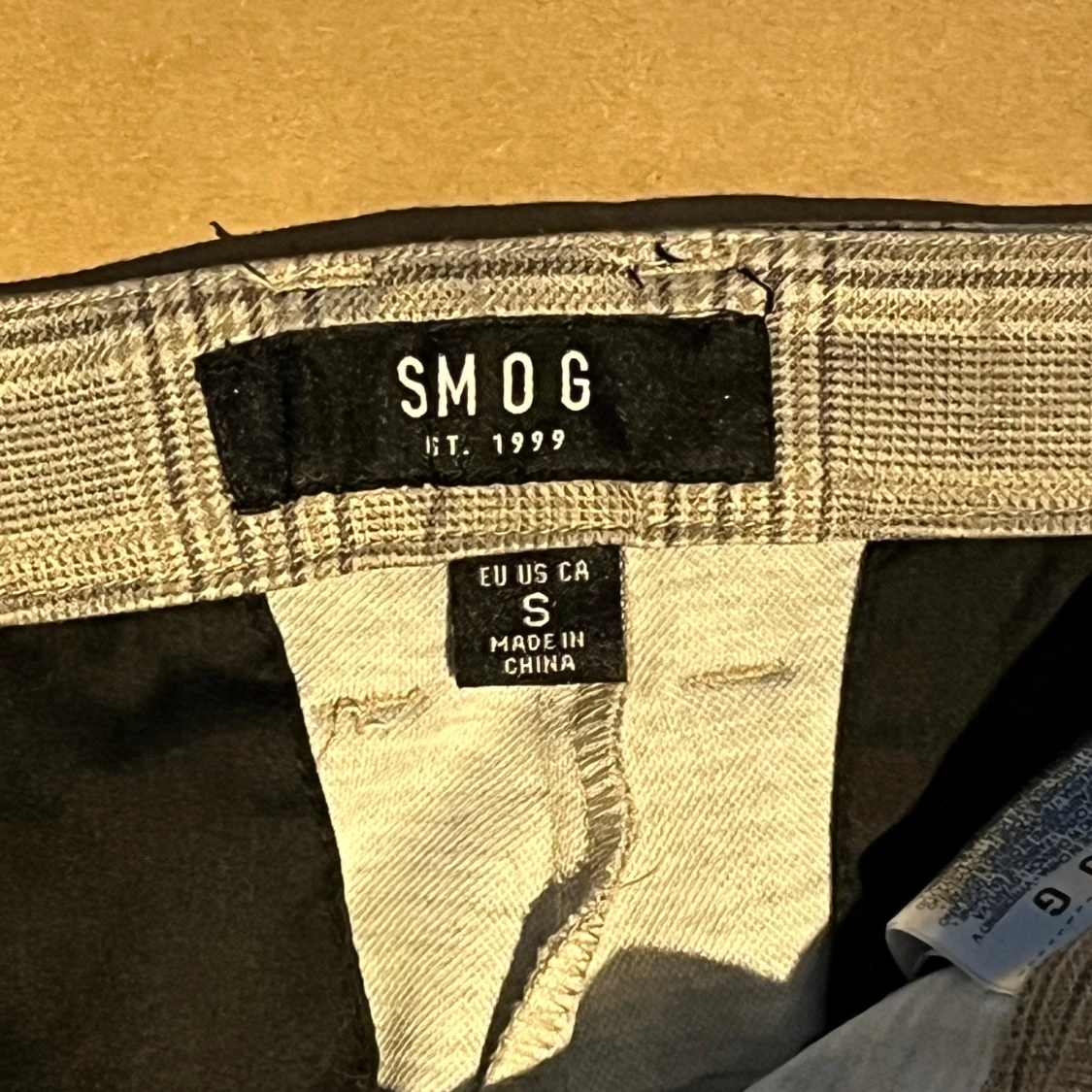 Snygga grå kostymbyxor från SMOG i storlek S. Byxorna har ett klassiskt rutigt mönster, raka ben och fickor med dragkedja. Perfekta för en stilren look.