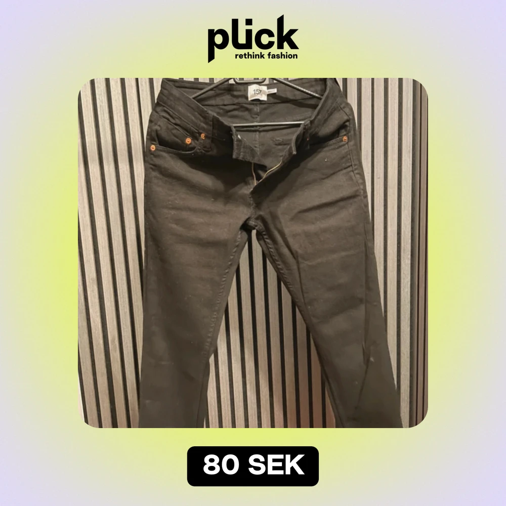 Säljer ett par svarta jeansbyxor från 157 i storlek S. Byxorna har en klassisk femficksdesign med orangea nitar och en snygg läderpatch baktill. Perfekta för både vardag och fest! 🖤