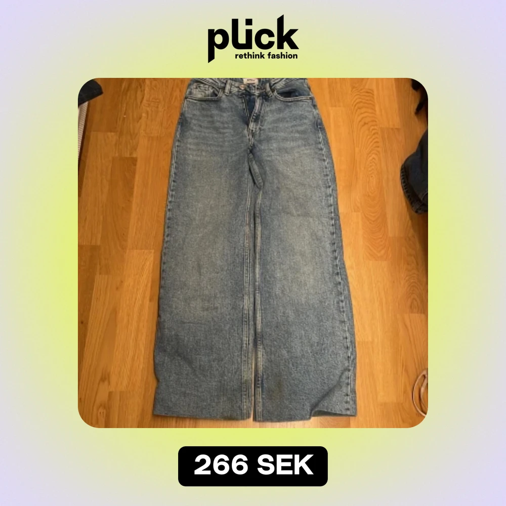 den här är en blå high waist jeans, bra material och passar för de som är runt 160 cm och storlek 34. Har använt ganska många gånger.