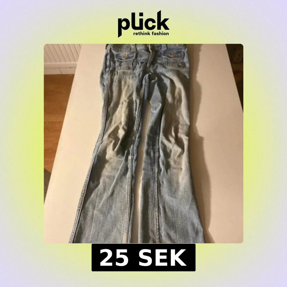 Ljusblå bootcut jeans från H&M med låg midja och justerbar midja. Klassisk femficksmodell med snygga ficklock och silverfärgade knappar framtill. Hål vid grenen.