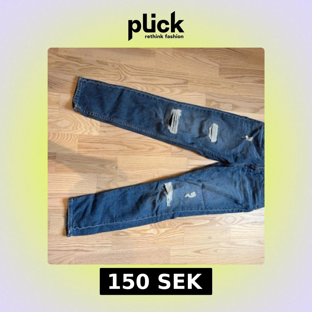 Snygga blå slim fit jeans från H&M med coola slitningar på framsidan. Klassisk femficksmodell och normal midja. Jeansen är gjorda i denim och har en rak passform som sitter tajt utan att vara obekväma. Perfekta för dig som gillar en avslappnad och trendig stil.