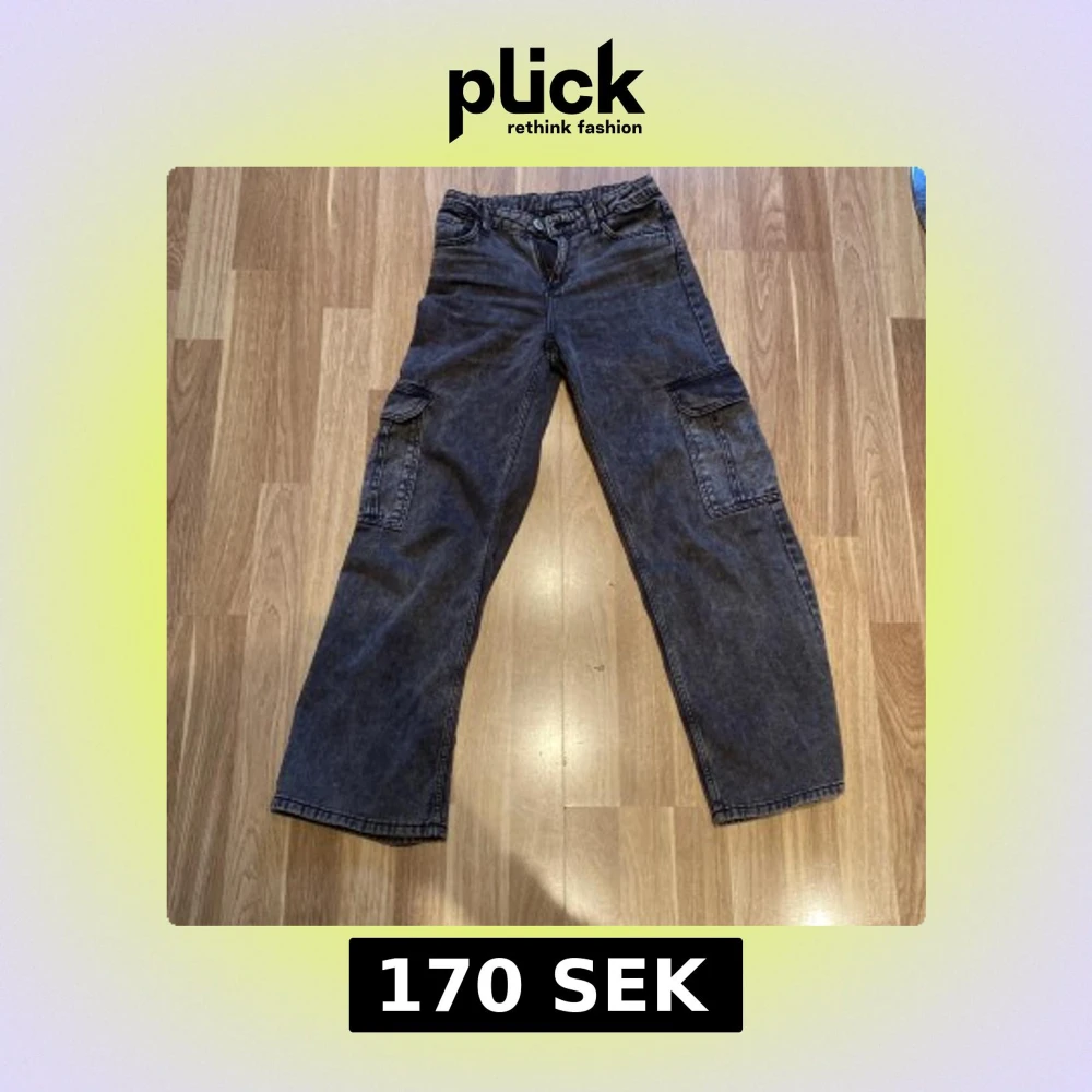 Säljer ett par grå cargobyxor med praktiska fickor på sidorna. Byxorna har en dragkedja och knapp framtill. Perfekta för en avslappnad stil. Jeansen är ifrån H&M.