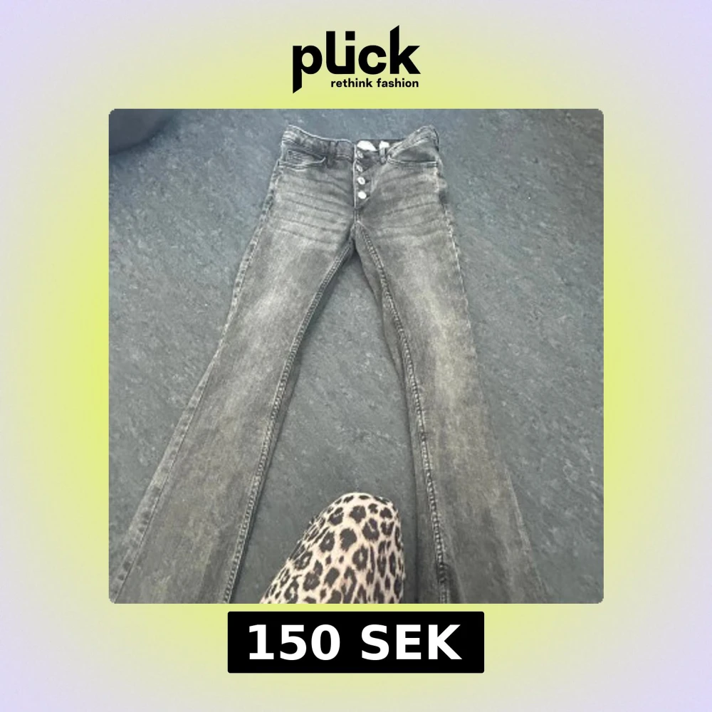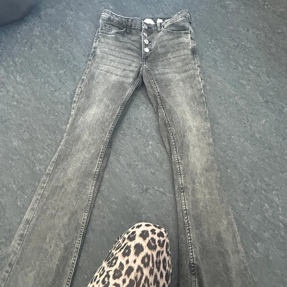 Snygga grå bootcut jeans från H&M med låg midja och justerbar midja. De har en knappgylf med fyra knappar och klassiska femficksdetaljer. Perfekta för en avslappnad stil.