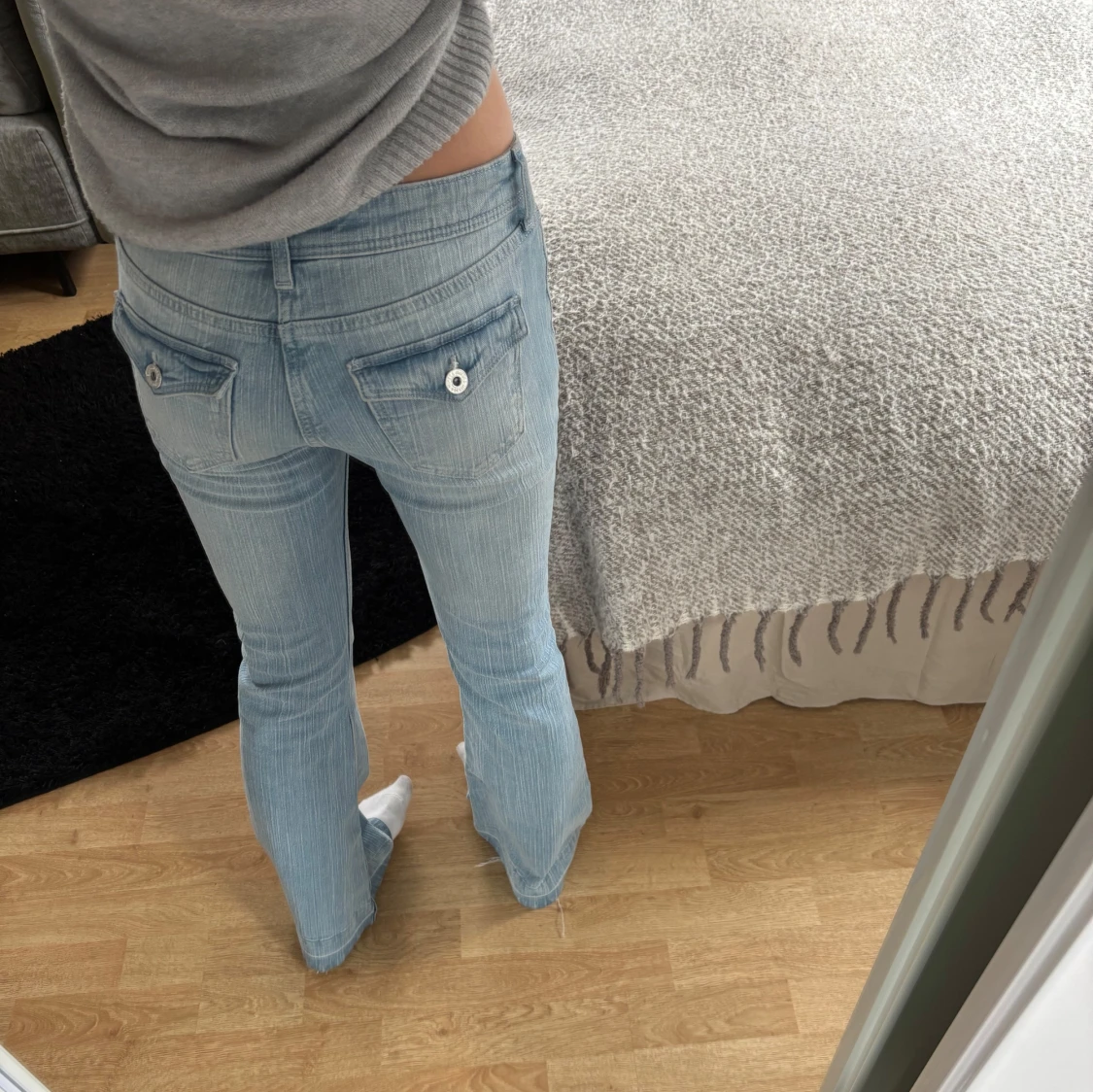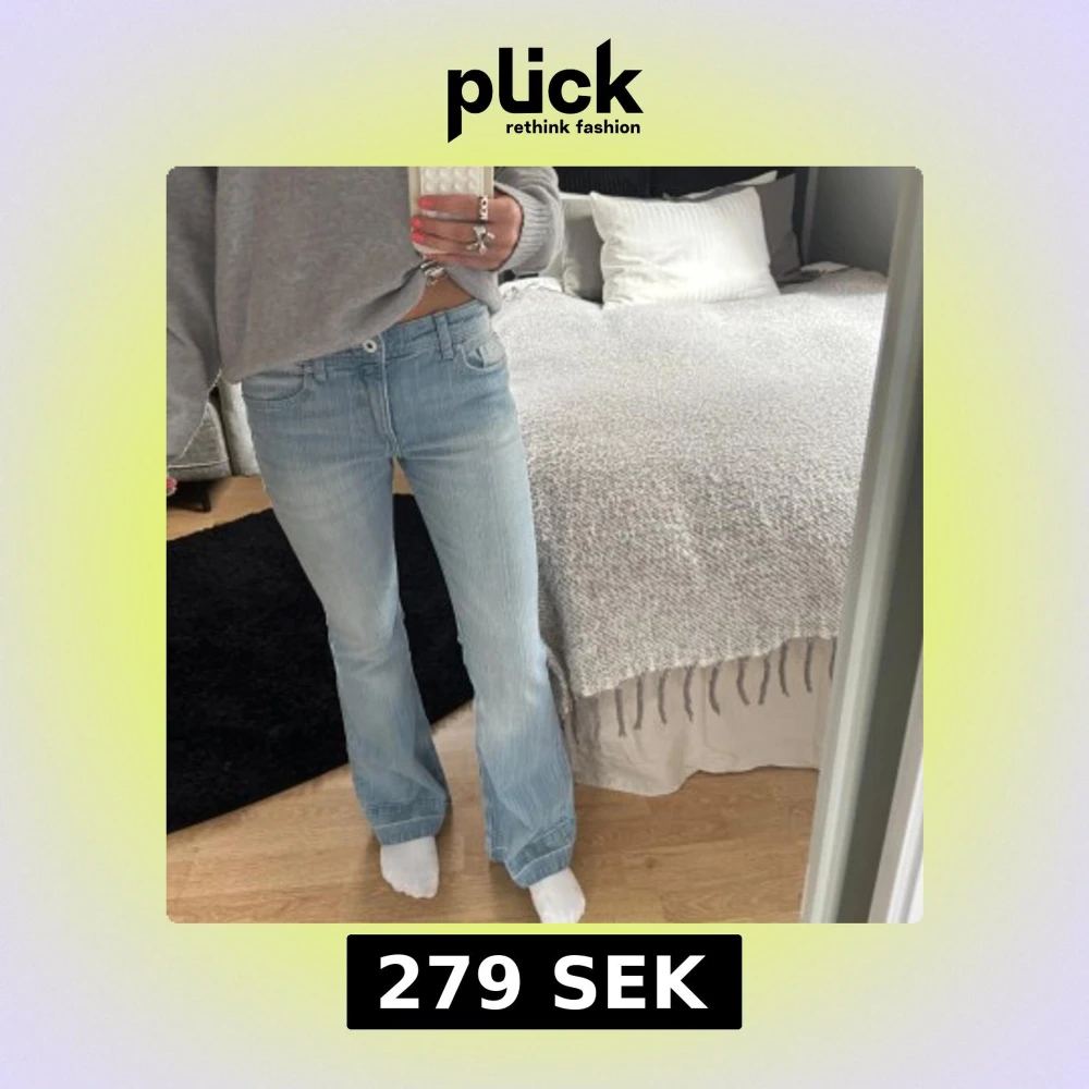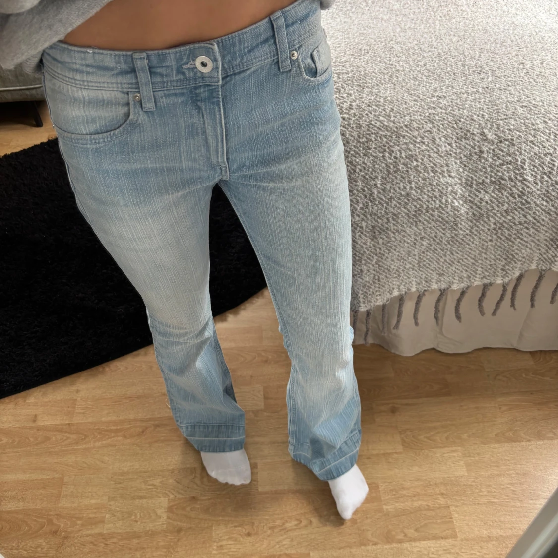 Säljer ett par ljusblå jeans från H&M med bootcut och midwaist. De har en ljus och fin tvätt/färg och är väldigt snygga att ha till en vanlig stickad tröja!☺️