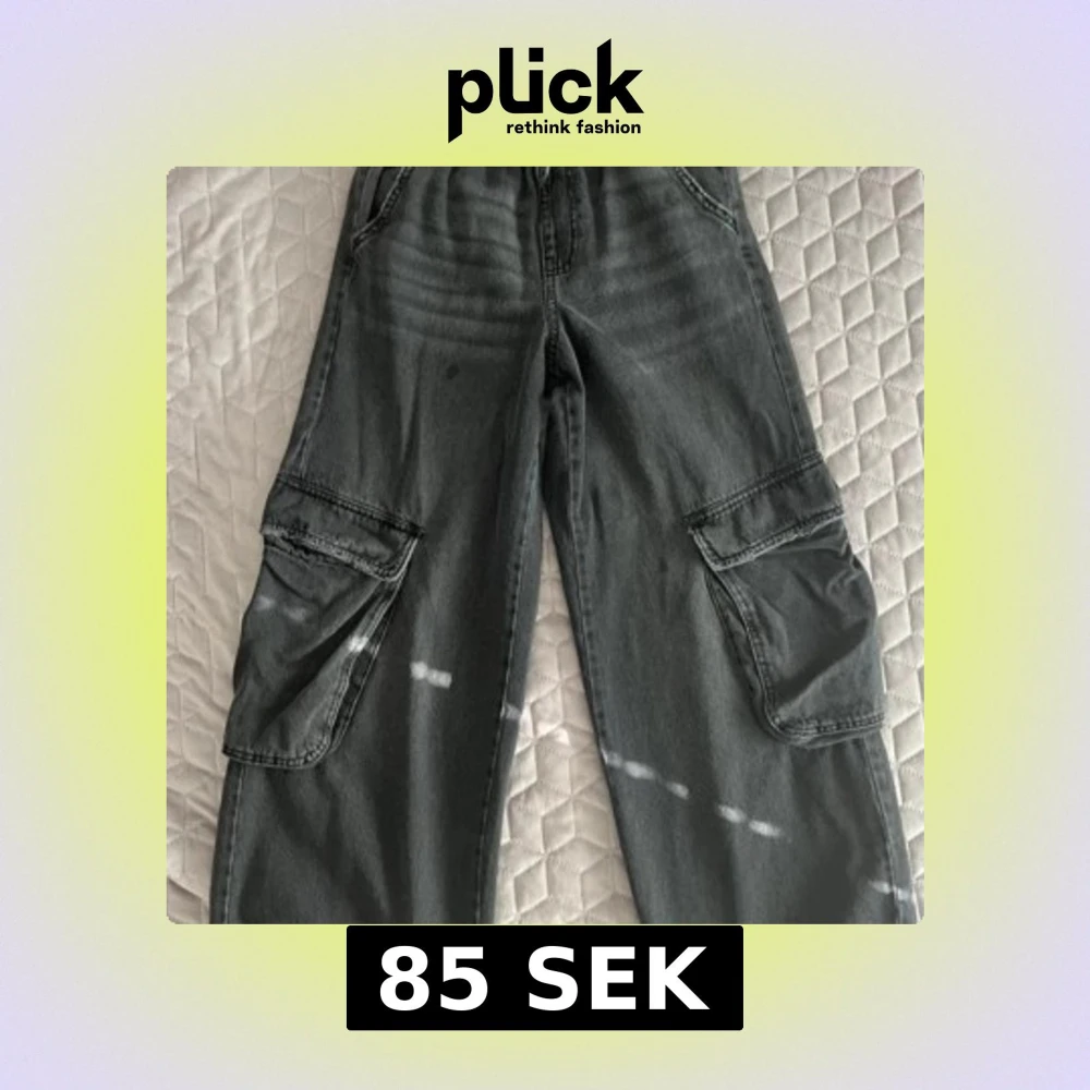 Säljer ett par grå cargopants med fickor på sidorna. Byxorna har en bekväm elastisk midja med snörning för justerbar passform. Fläcken på byxorna är bara vatten från strykjärnet!! Alla pris kan diskuteras!