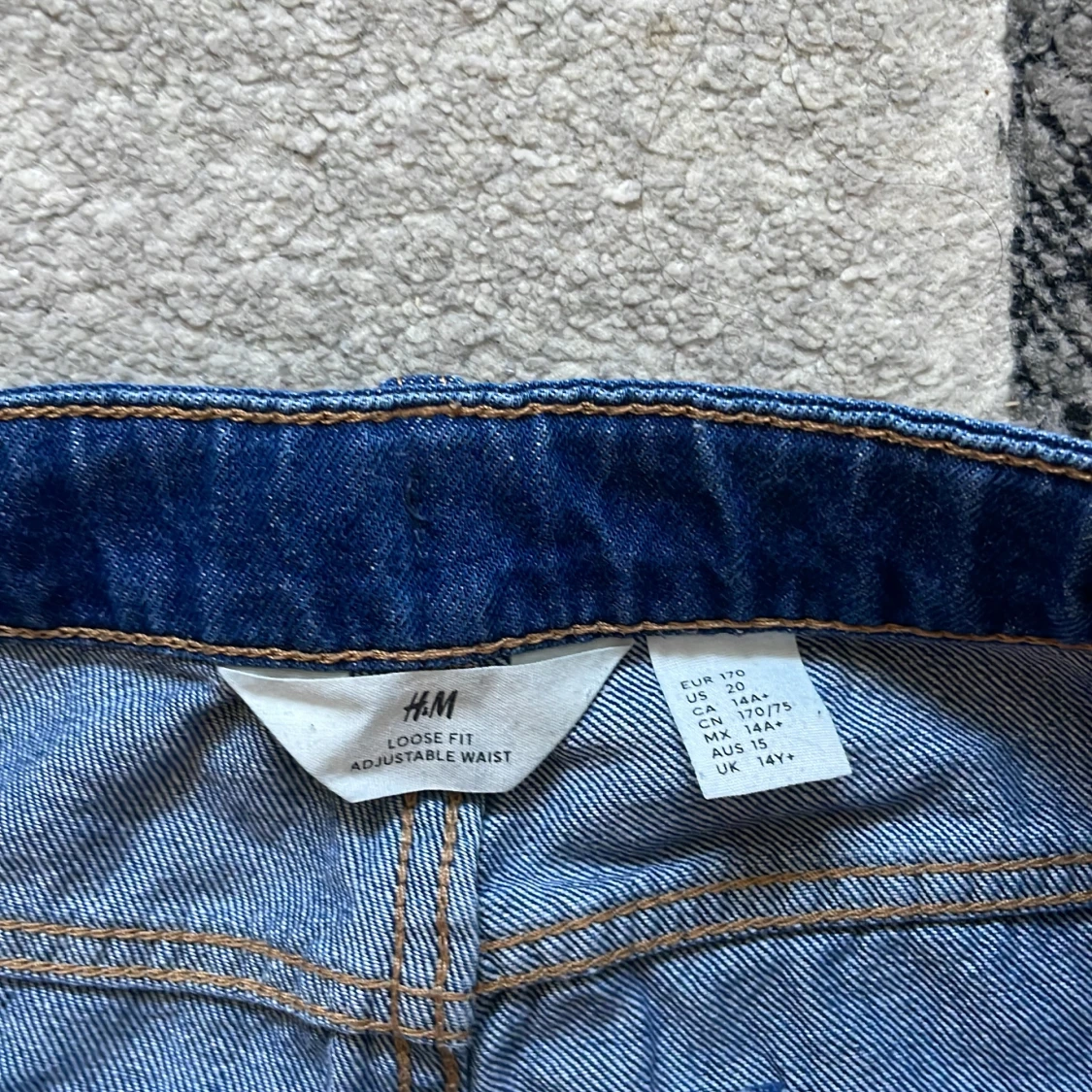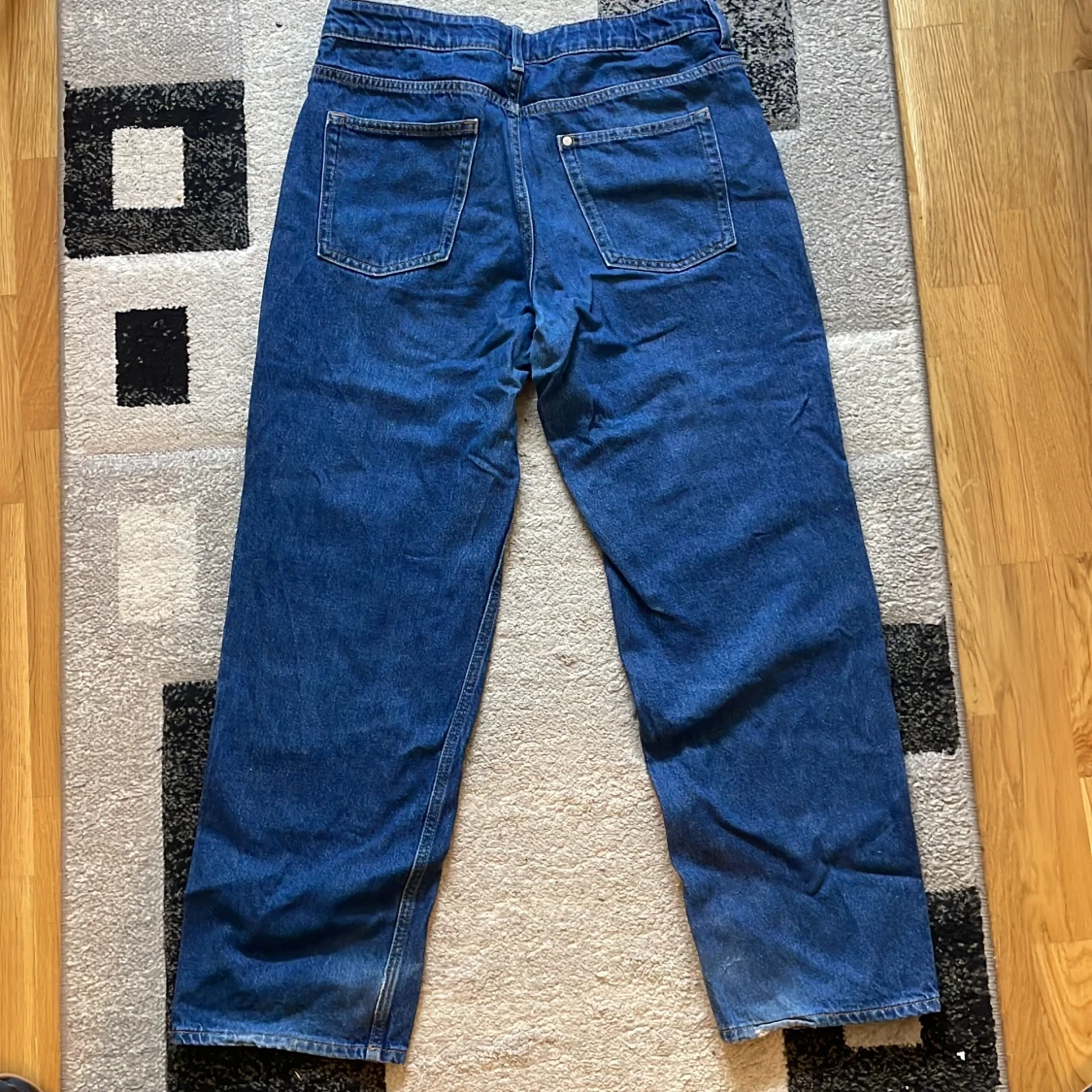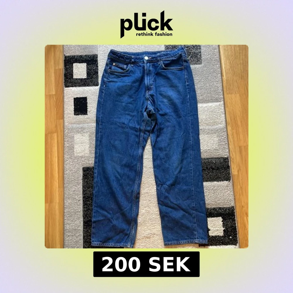 Säljer ett par blå loose fit jeans från H&M med justerbar midja. Klassisk femficksmodell i denim med raka ben och avslappnad passform. Perfekta för en chill och avslappnad stil.