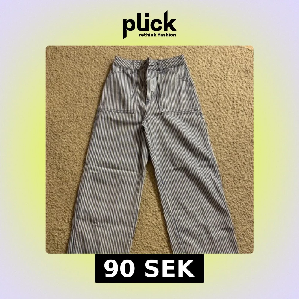 Säljer ett par blå- och vitrandiga cargopants från H&M i 100% bomull. Byxorna har flera fickor på benen och raka ben med loose fit. Perfekta för dig som gillar en avslappnad och trendig stil. Snygga att matcha med en enkel t-shirt eller hoodie.