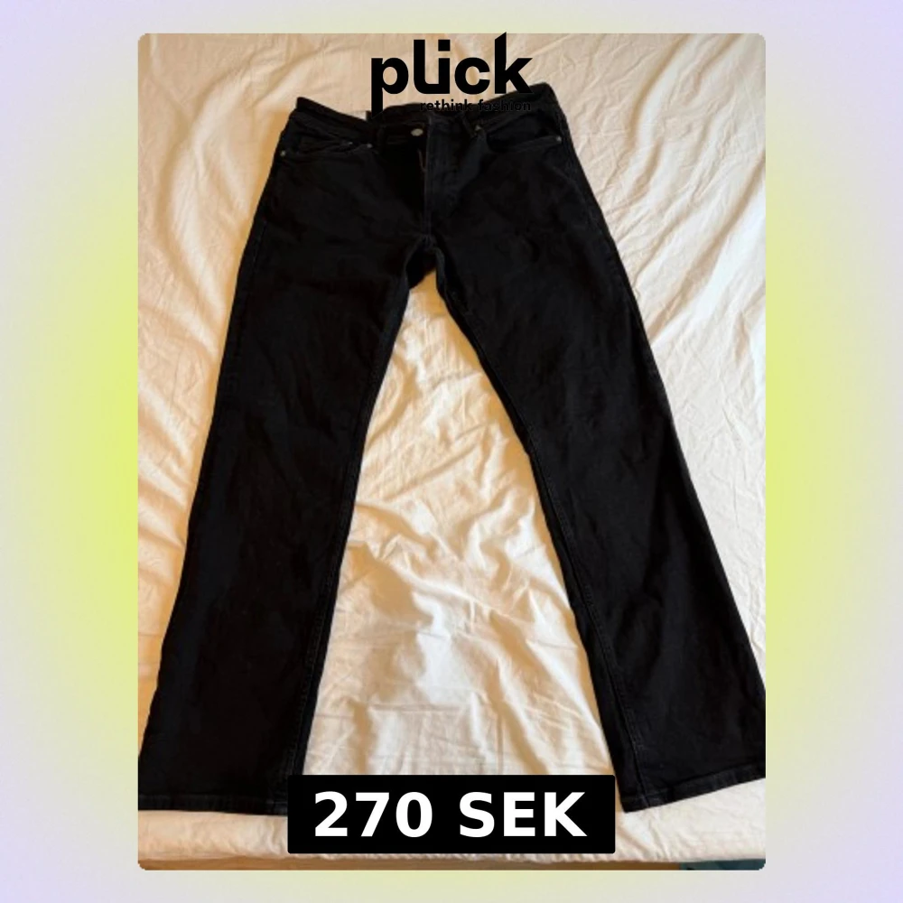 Svarta jeans från H&M med straight passform och regular fit. Klassisk femficksmodell med dragkedja och knapp framtill. Snyggt stilrena och passar perfekt till sneakers eller boots. Materialet är jeans och färgen är helsvart.