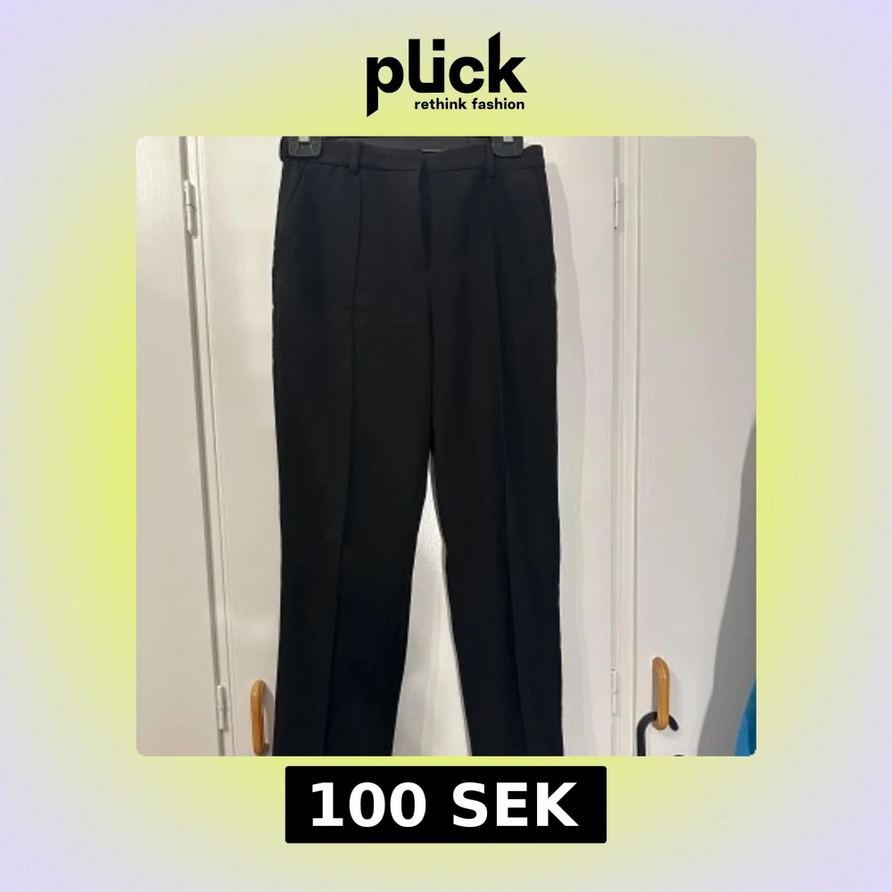 Klassiska svarta kostymbyxor från H&M med raka ben, pressveck och hällor för bälte. Byxorna har dragkedja och knappstängning framtill samt diskreta bakfickor. Perfekta för en clean och stilren look.