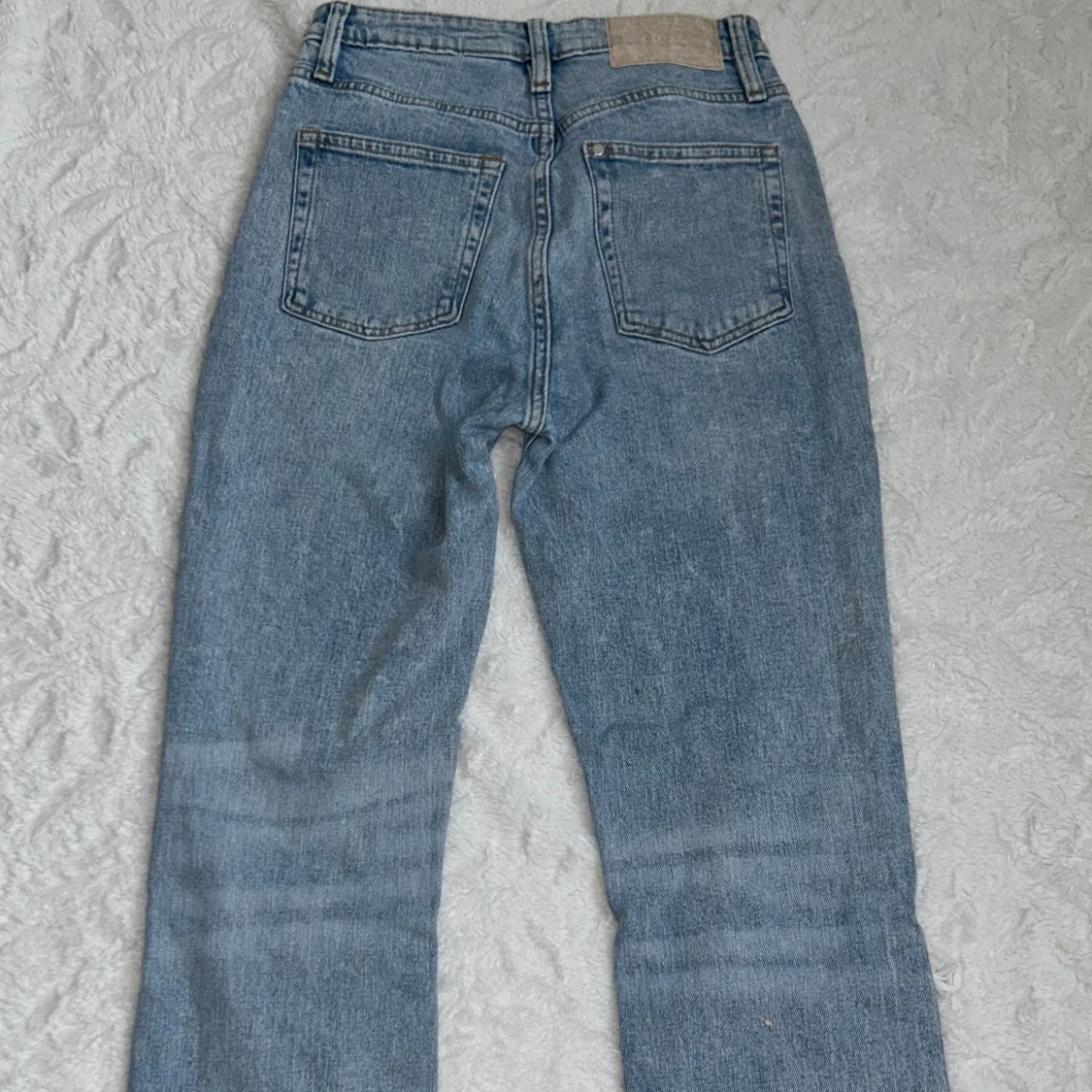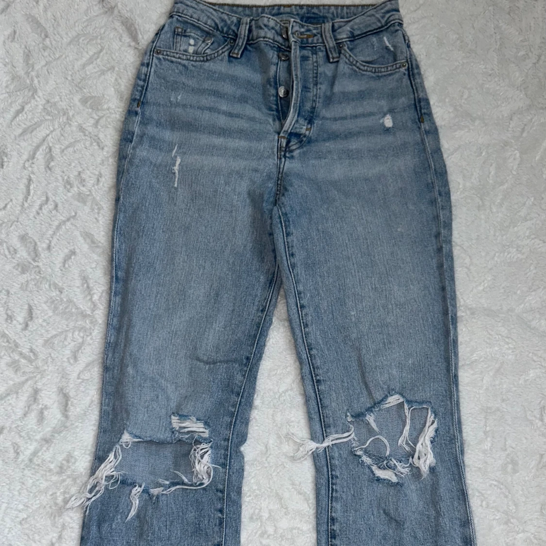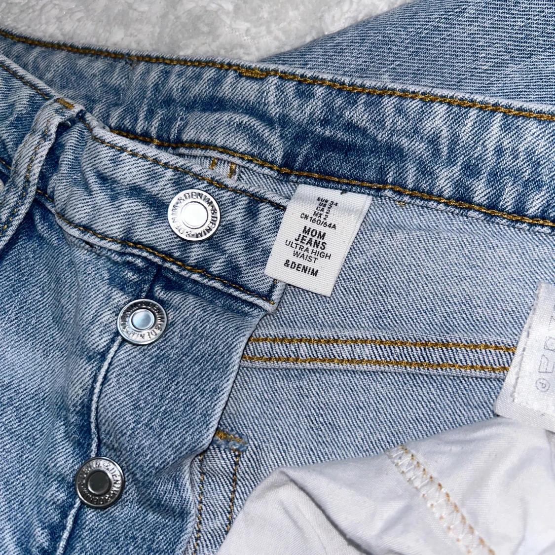 Snygga ljusblå mom jeans från H&M med ultra high waist. Jeansen har raka ben, slitna detaljer och hål vid knäna. Klassisk femficksmodell i bomullsdenim med knappgylf. Skriv vid frågor 🥰