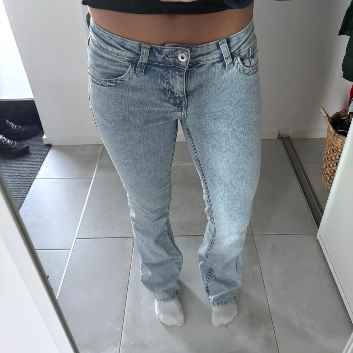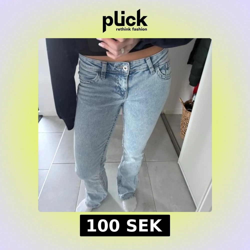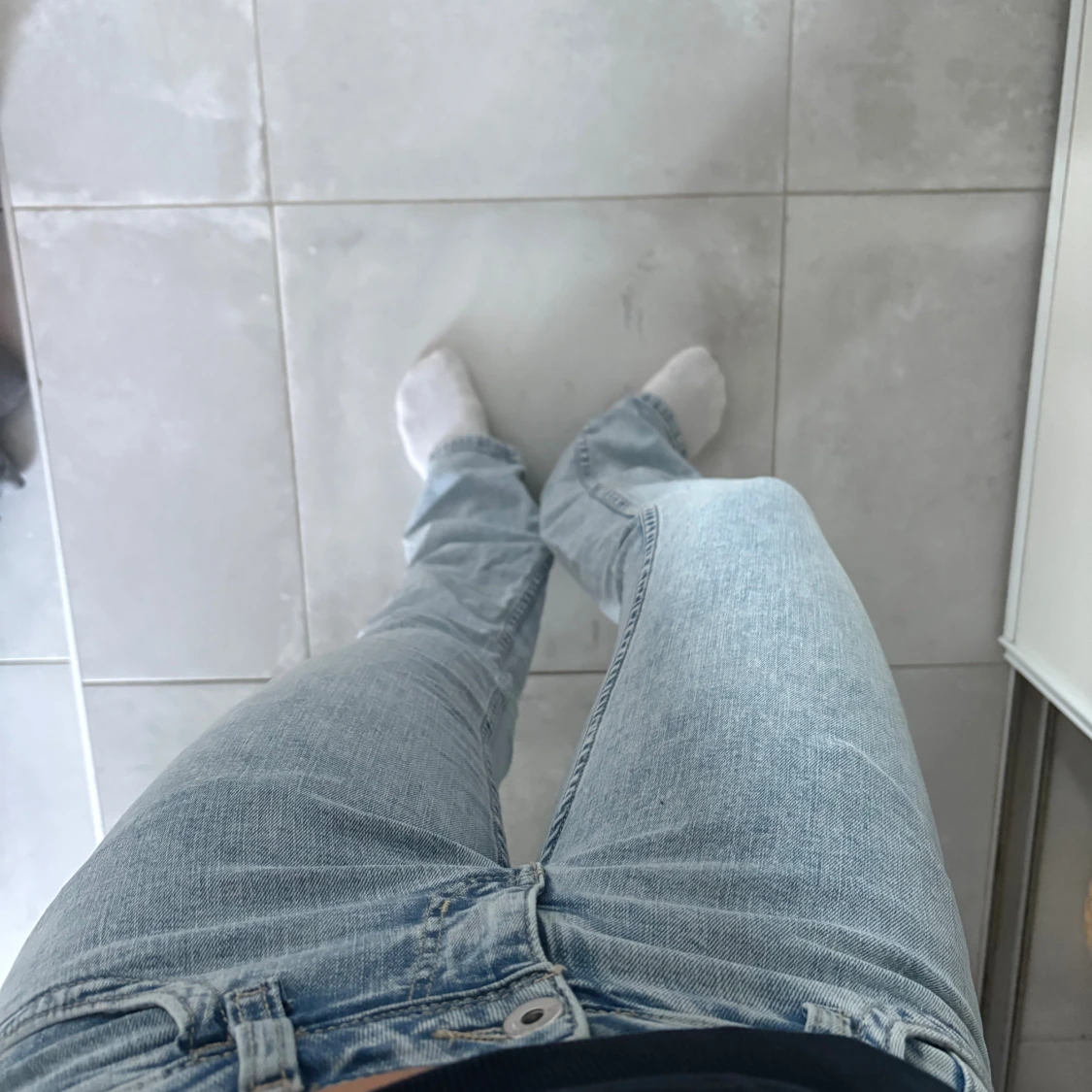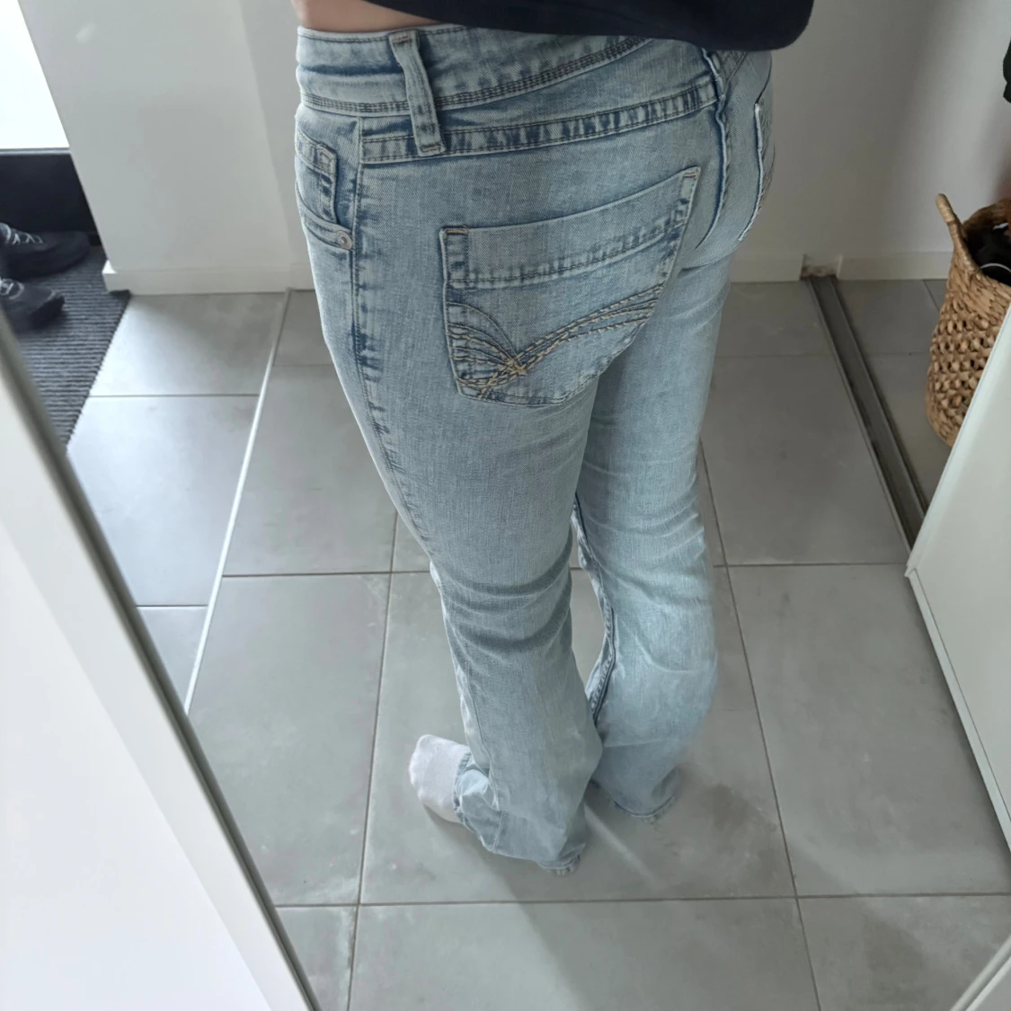 Säljer ett par ljusblå jeans med bootcut. Från hm i storlek 34